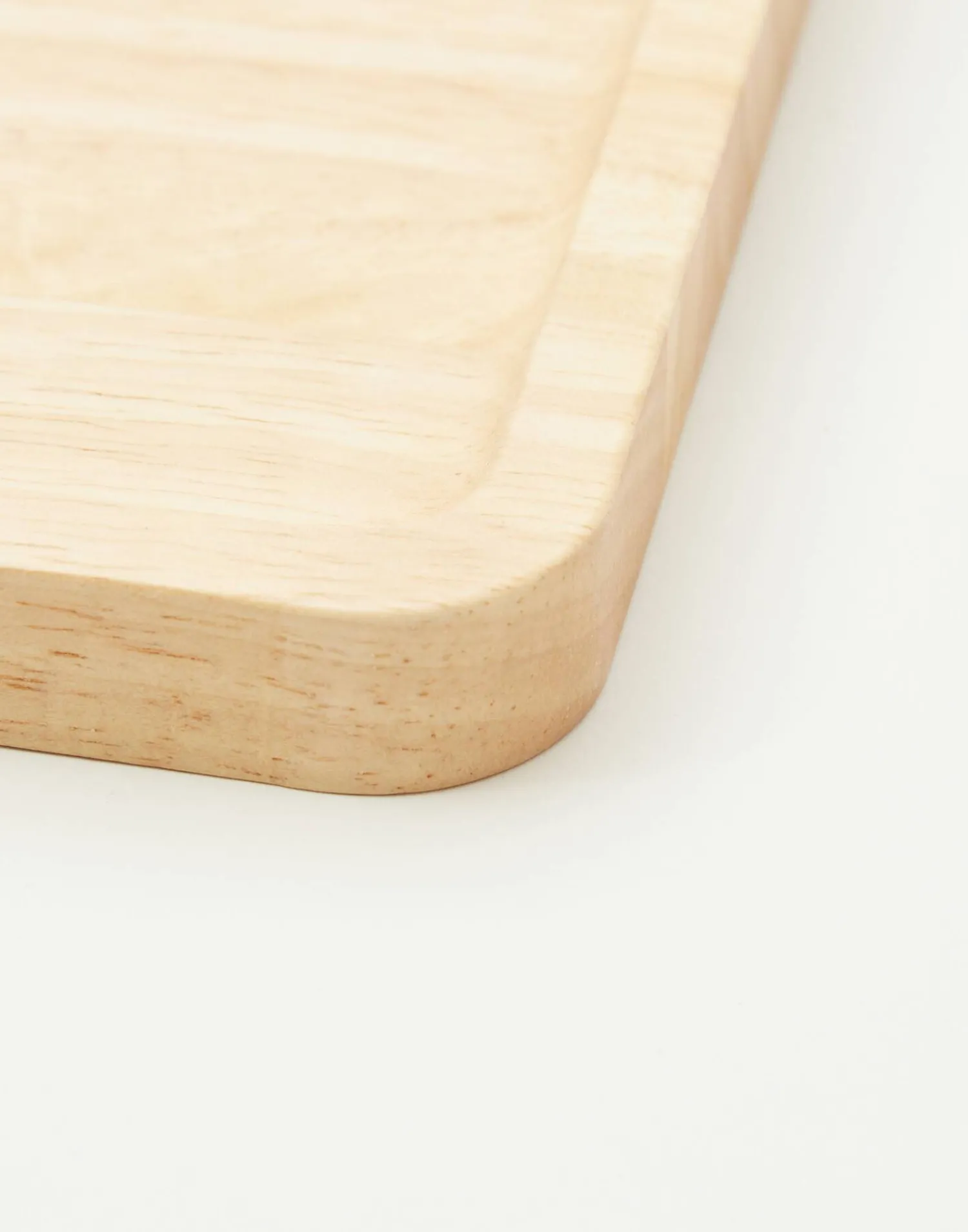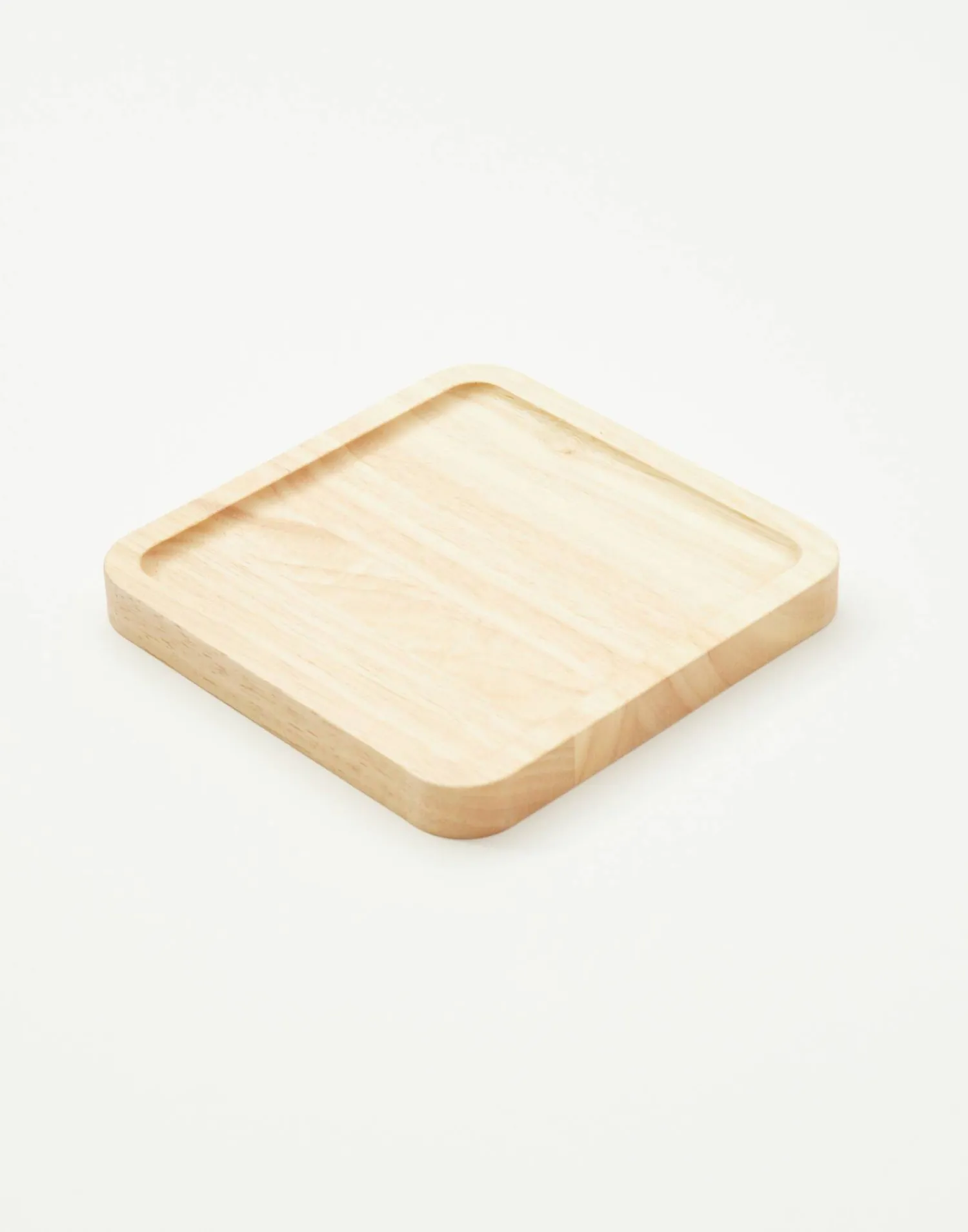 Bandeja cuadrada de madera con borde bajo y esquinas redondeadas.