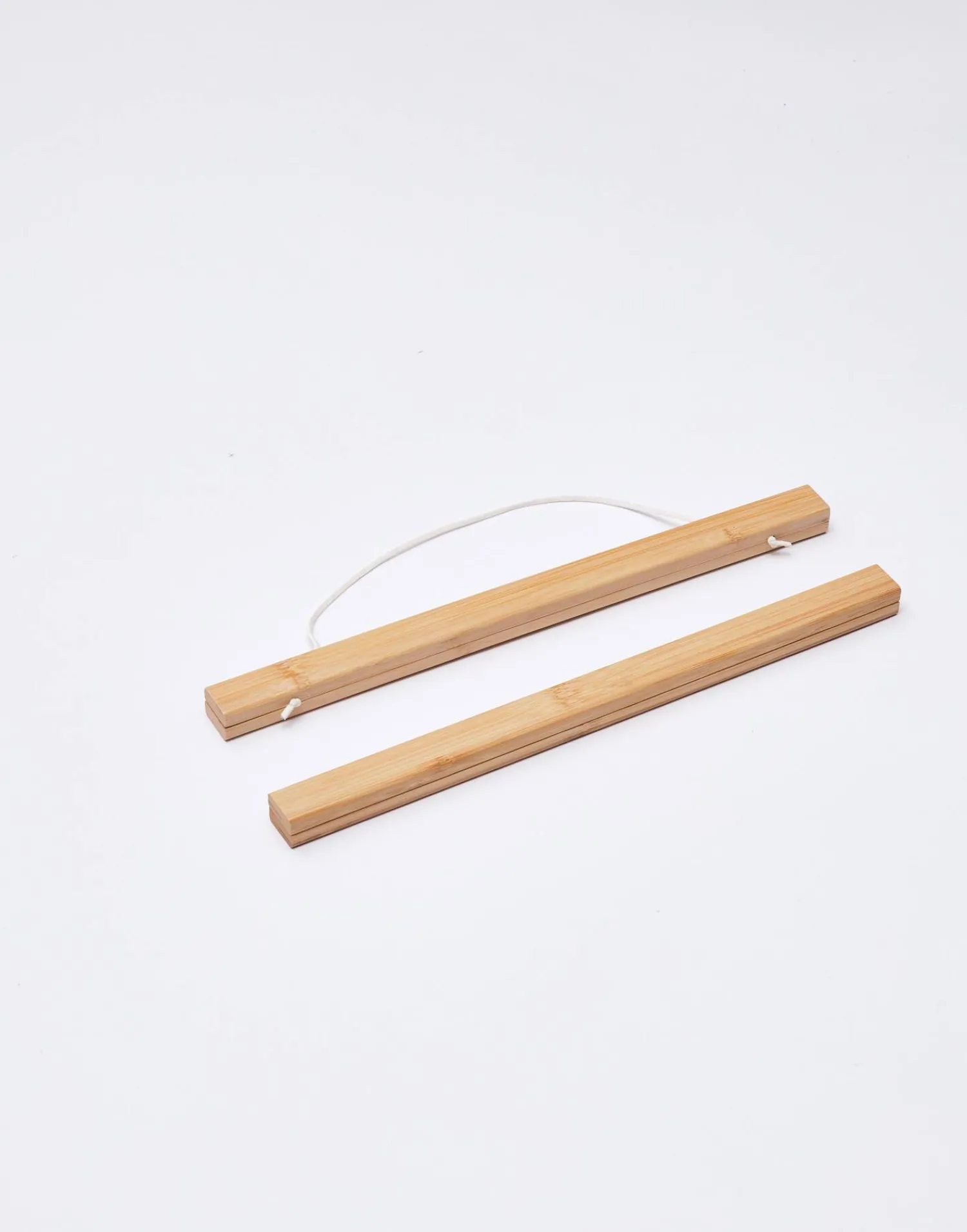 2 tiras de sujeción de bambú para láminas decorativas. Cada una de las tiras está formada por dos piezas que se unen mediante imanes ocultos que también sujetan la láimina. Una de las tiras incorpora una cuerda para colgarlo.
