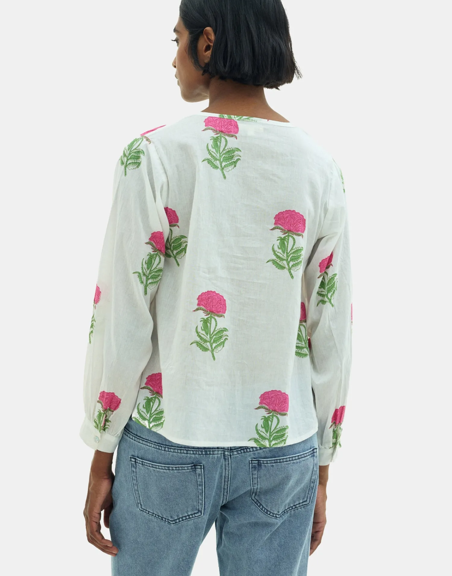 Blusa estampada de manga larga, con puños abotonados y cuello redondo. Cierre frontal de botones.
