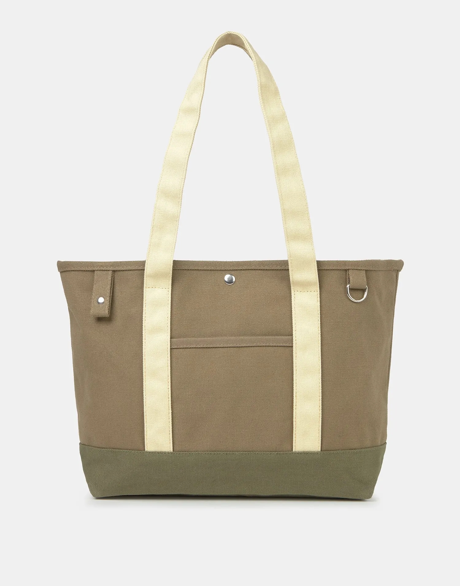Bolso con doble asa para llevar al hombro, bolsillo exterior y cierre de botón.