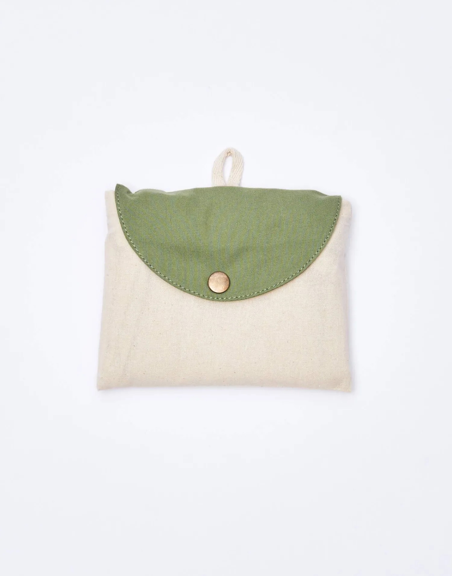 Bolsa tipo tote bag de algodón con doble asa para llevar al hombro. Se guarda plegada en pequeña bolsita con cierre de botón para que puedas llevarla siempre contigo. Una vez abierta la bolsita se convierte en bolsillo interior.