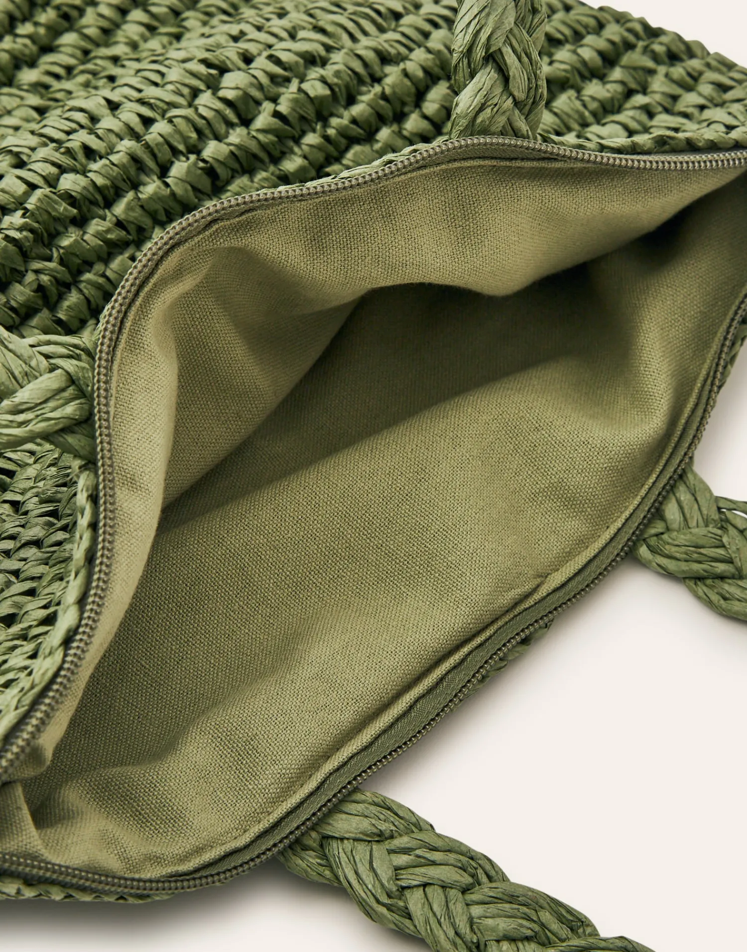 Bolso de papel con cierre de cremallera y forro interior. Asa para llevar al hombro.