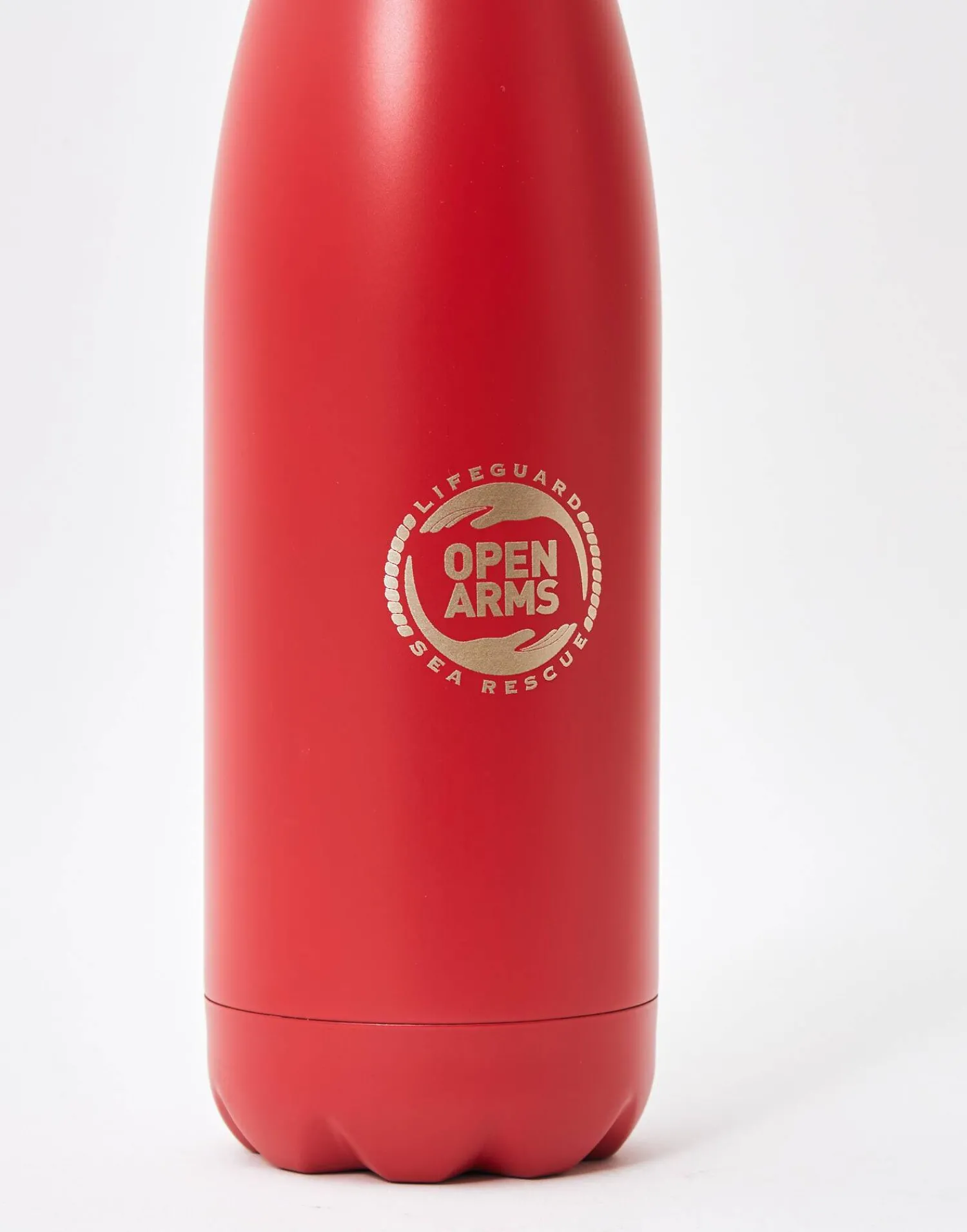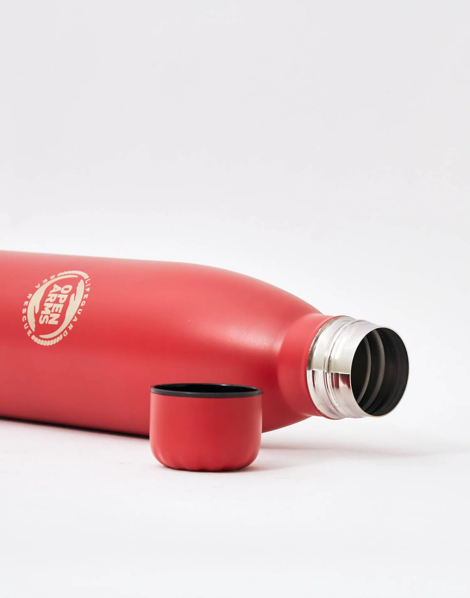 Botella reutilizable de acero inoxidable con tapón de seguridad con rosca. Lleva contigo el agua que necesitas, conservando su temperatura y declarando que eres cómplice de la causa de Open Arms. Tu contribución les ayuda a seguir salvando vidas.