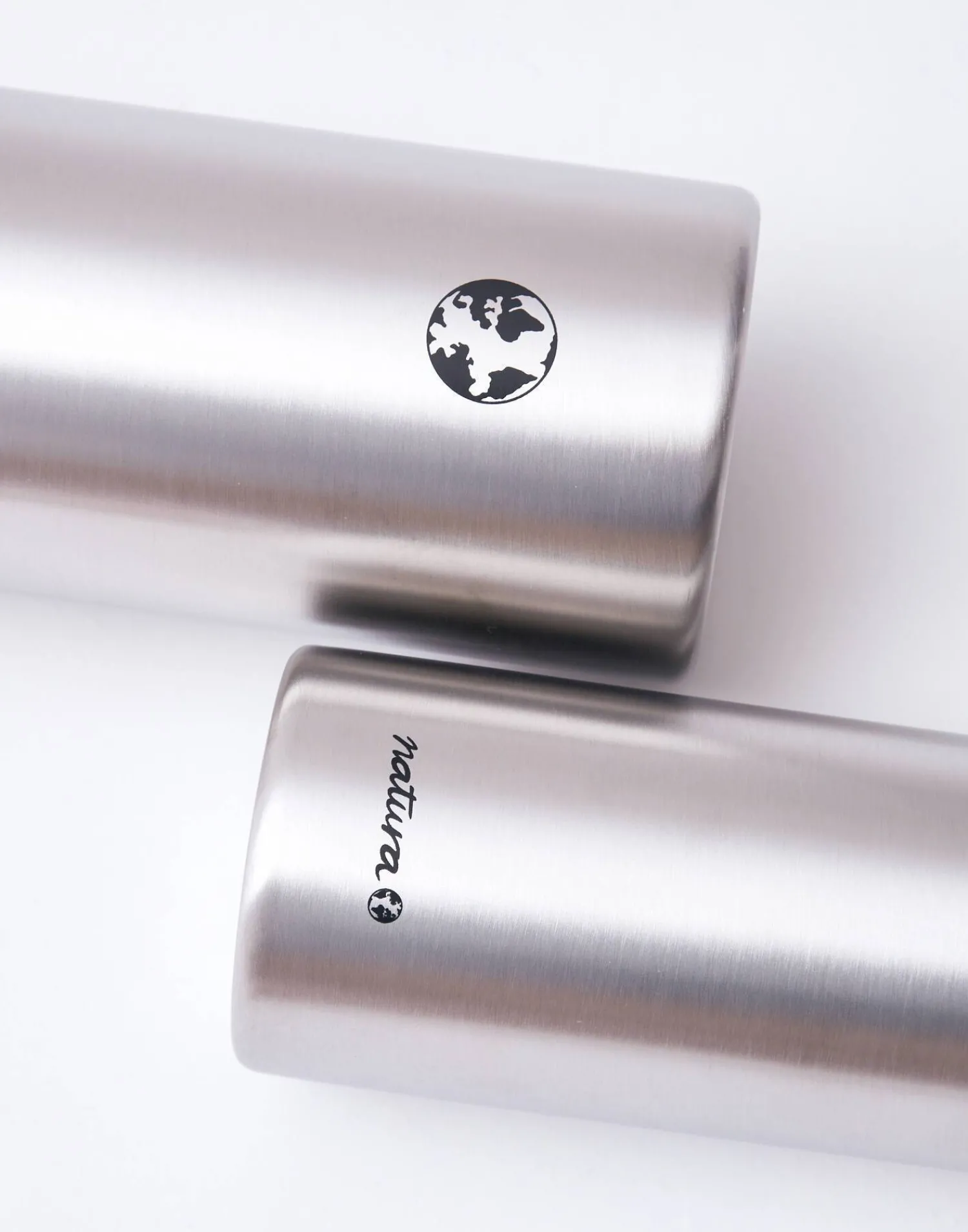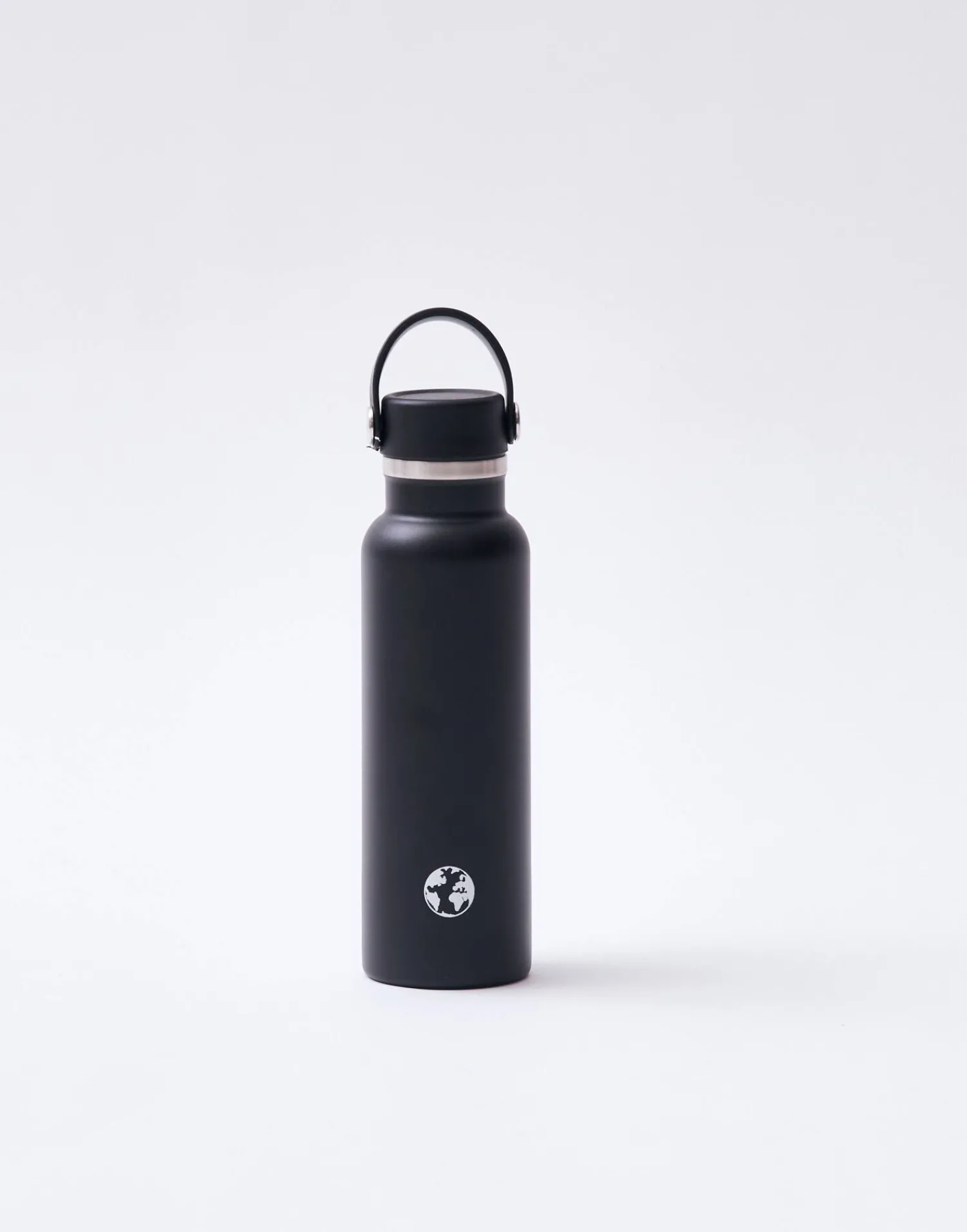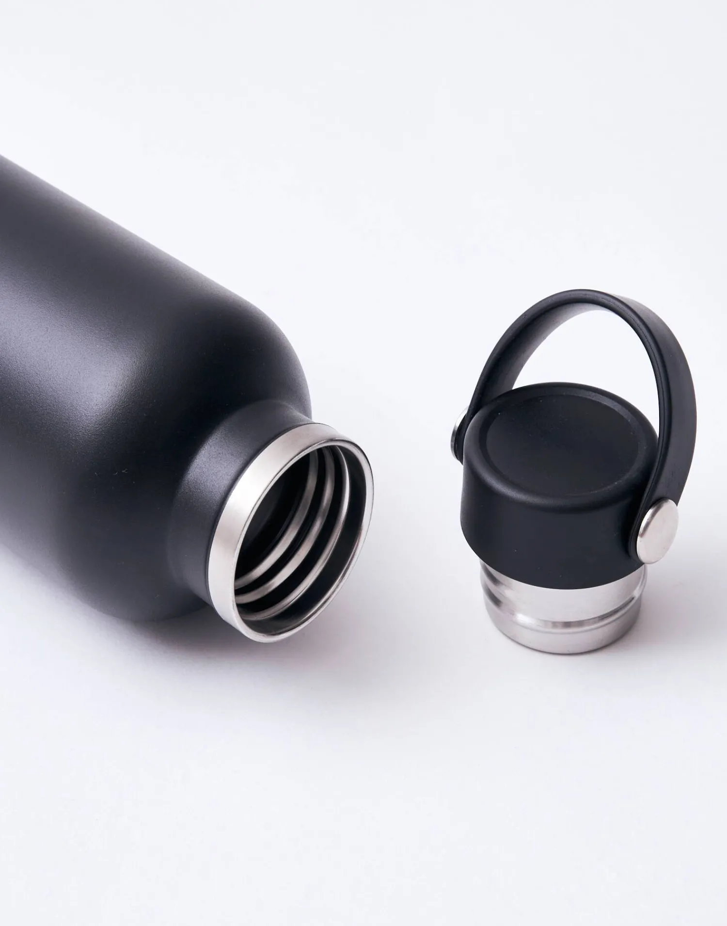 Botella reutilizable de acero inoxidable que puede utilizarse como termo. Acabada en tapón con asa.