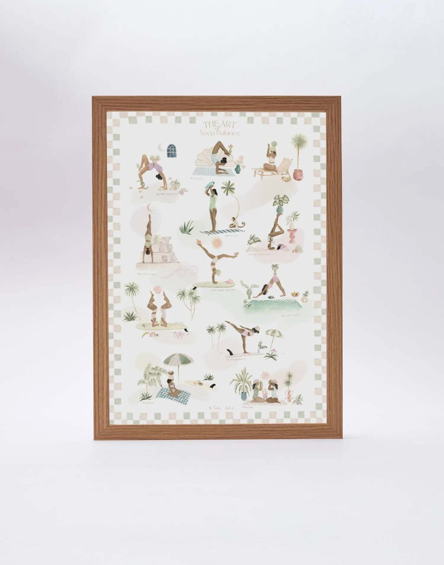 Lámina con ilustración de posturas de yoga enmarcada en madera.