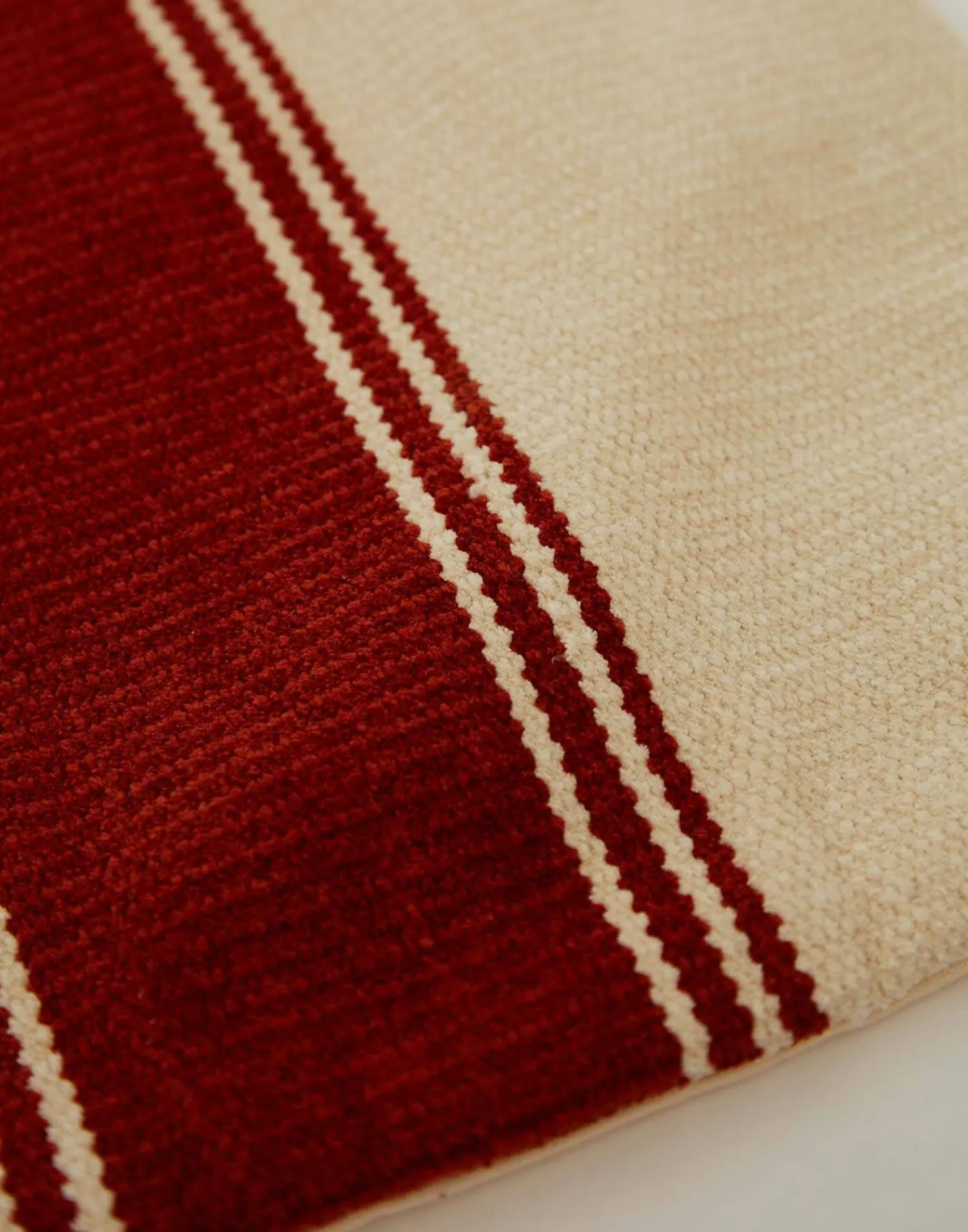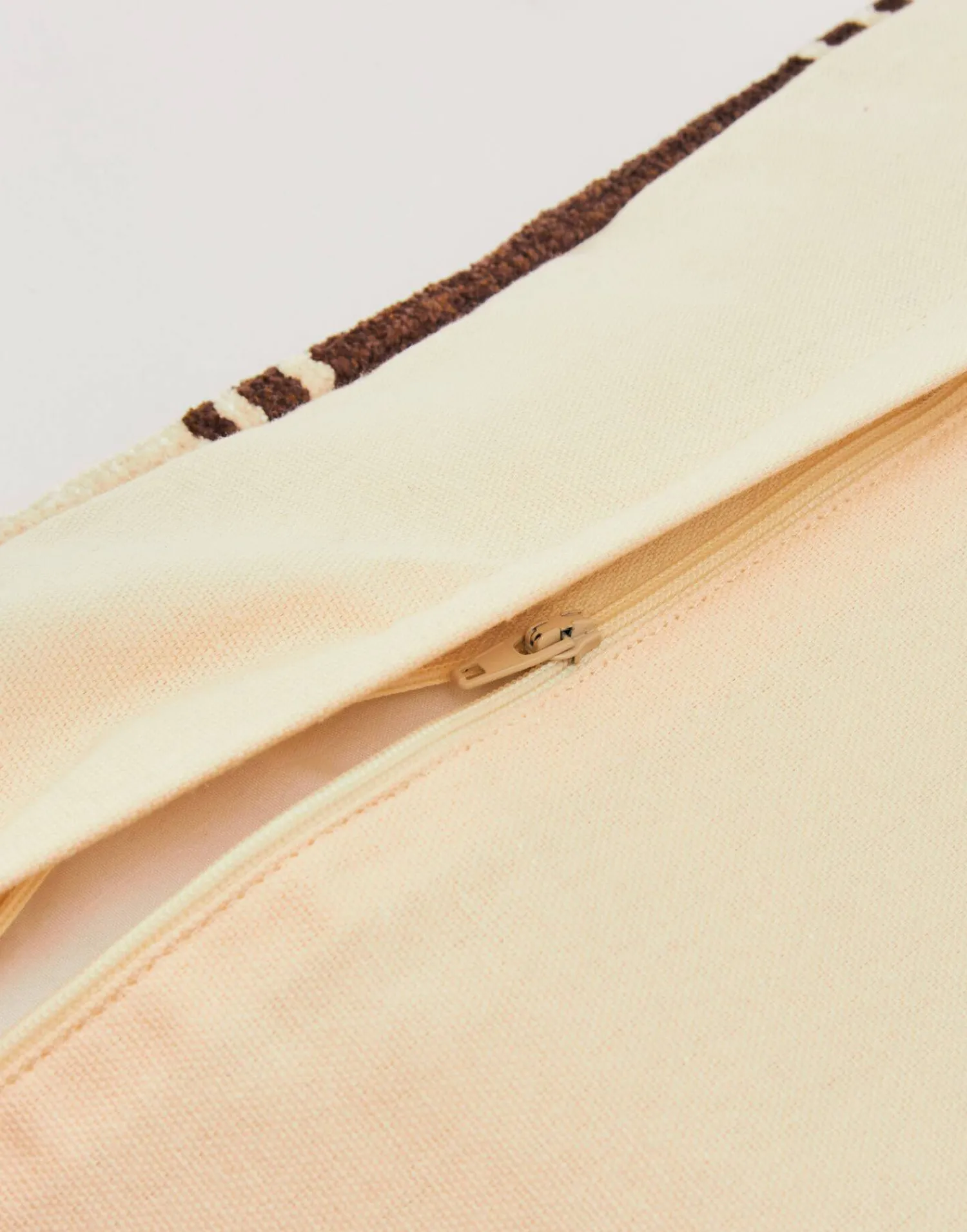 Funda de cojín con diseño de rayas en la parte frontal y pompones en las esquinas. Cierre de cremallera en la parte trasera.