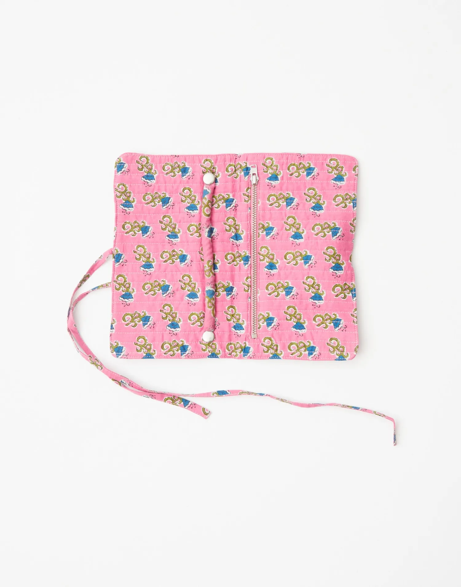 Un vez cerrado, se ata con una cuerda del mismo estampado.