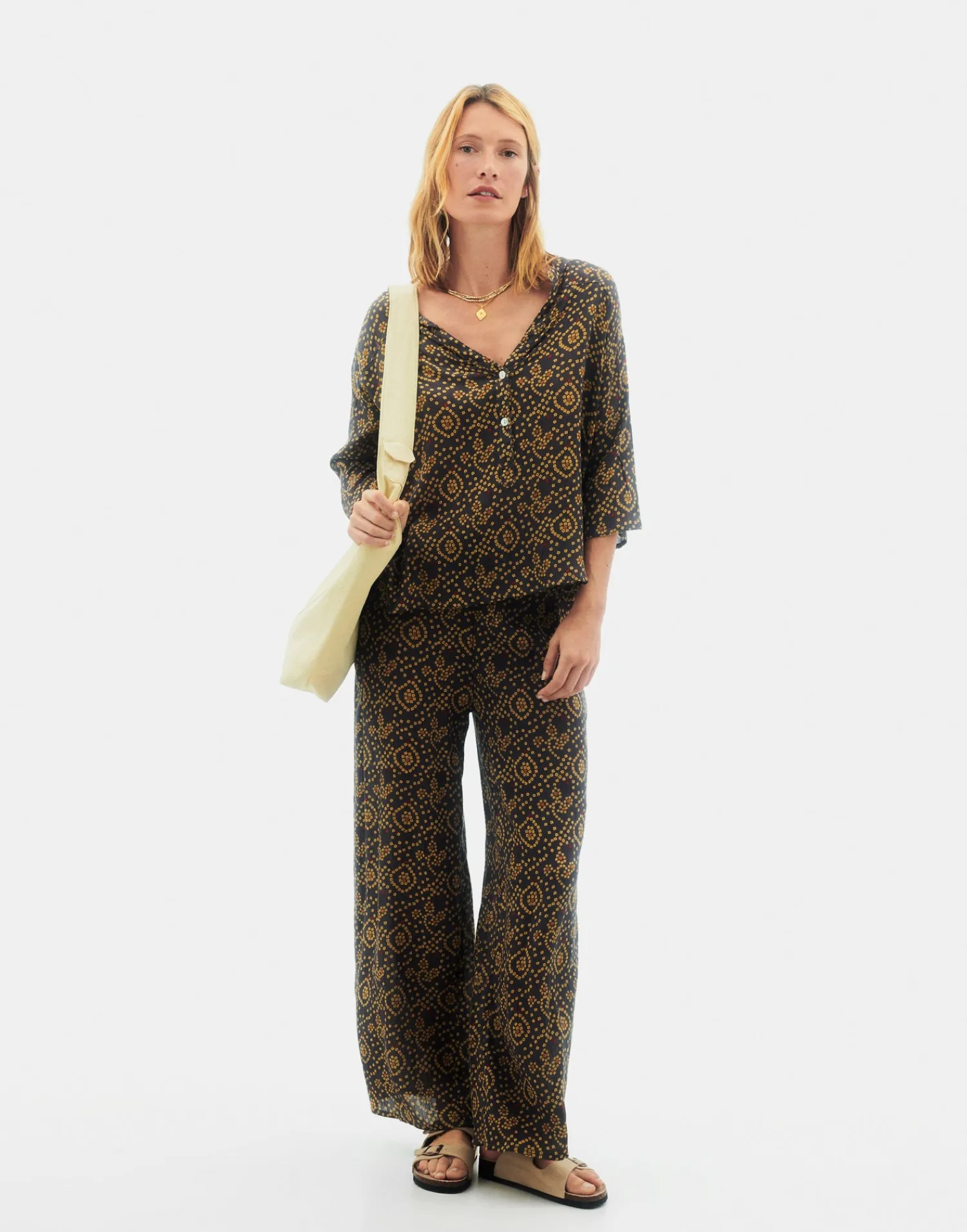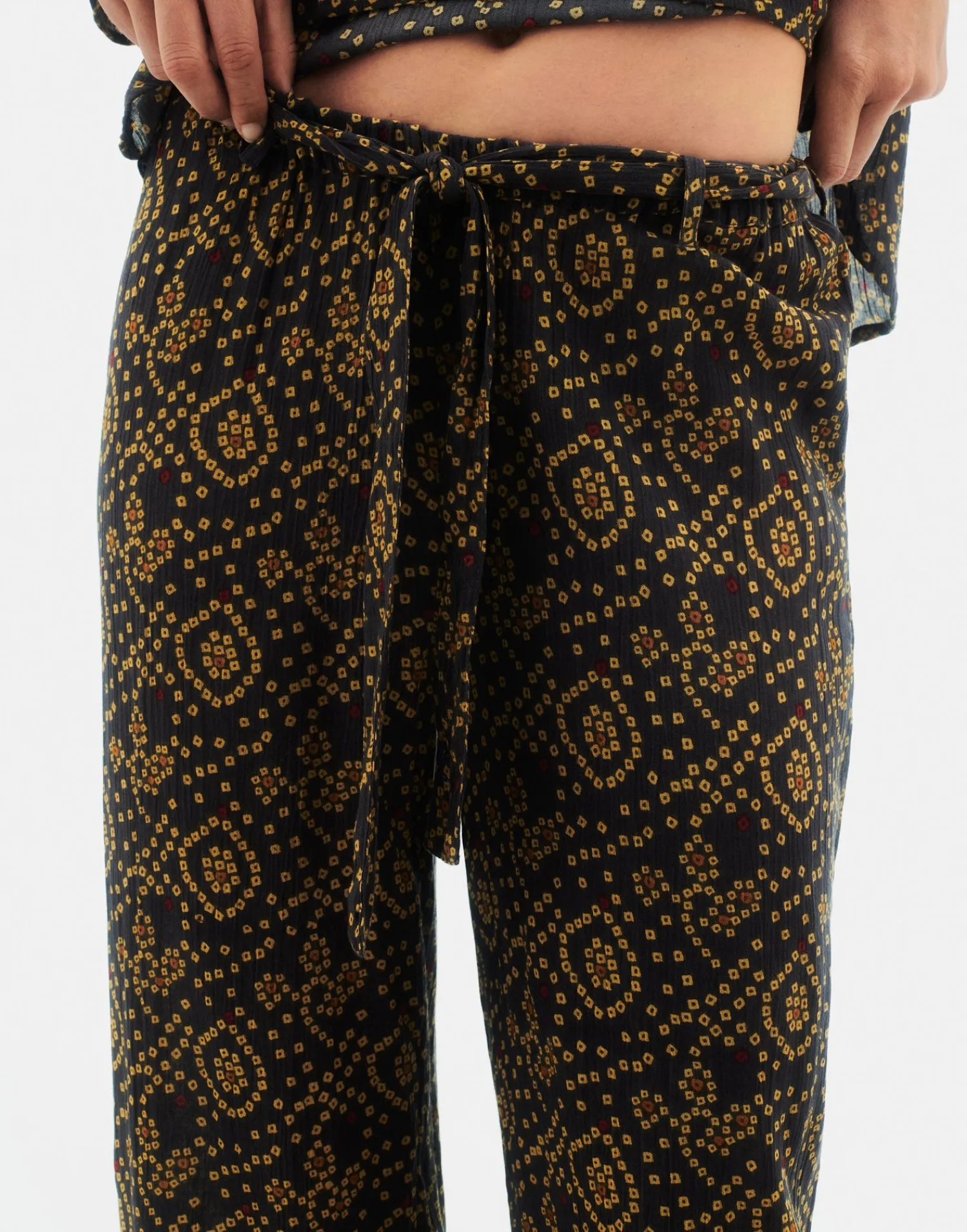 Pantalón recto con estampado estilo bandani y cintura elástica ajustable mediante lazo.
