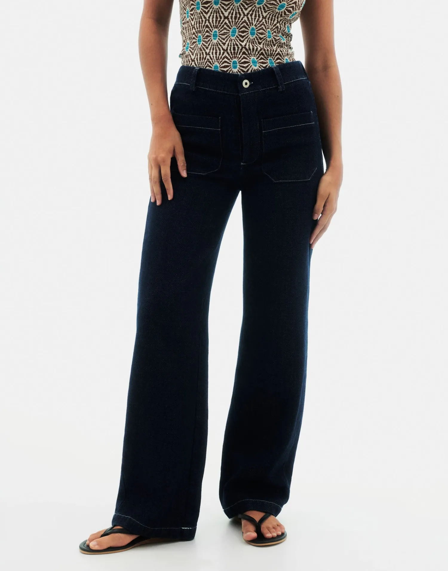 Jeans de corte recto y tiro alto con cierre frontal de botón y cremallera oculta. Bolsillos de plastrón en la parte frontal y en la parte trasera.