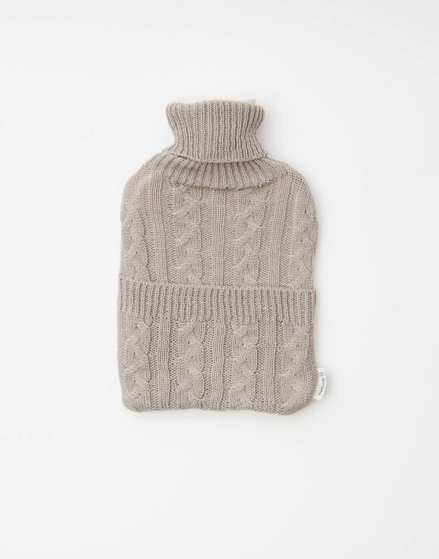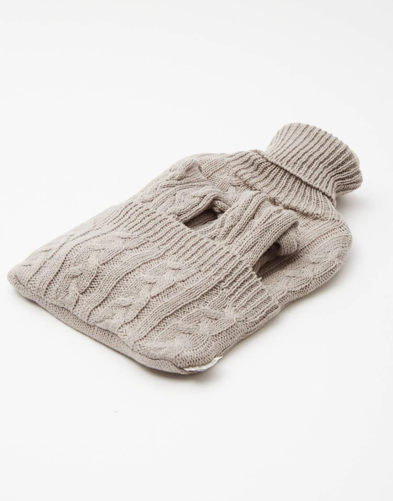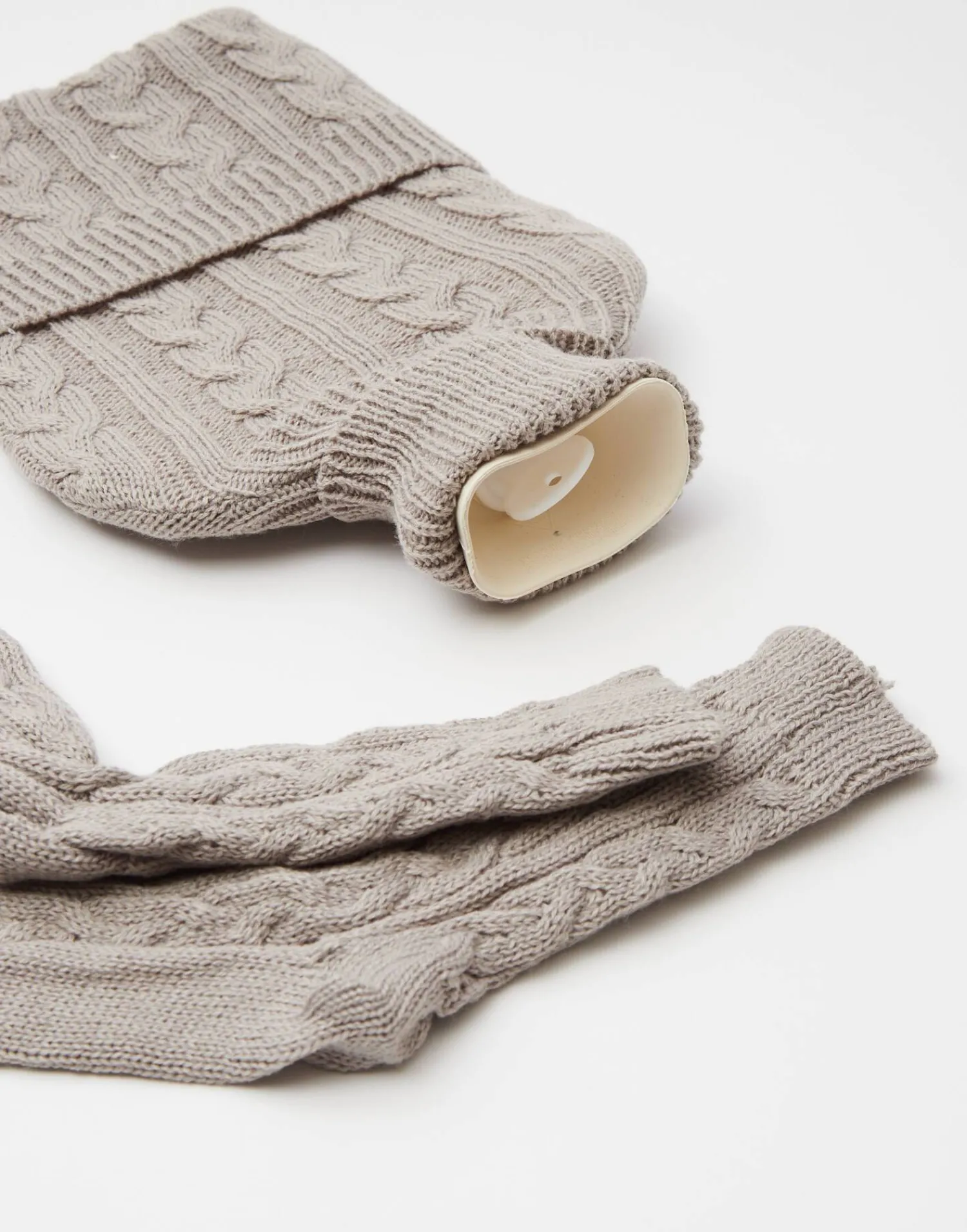 Set compuesto por una botella de agua caliente con capacidad de 2 litros y funda de punto trenzada con bolsillo y un par de calcetines a juego.