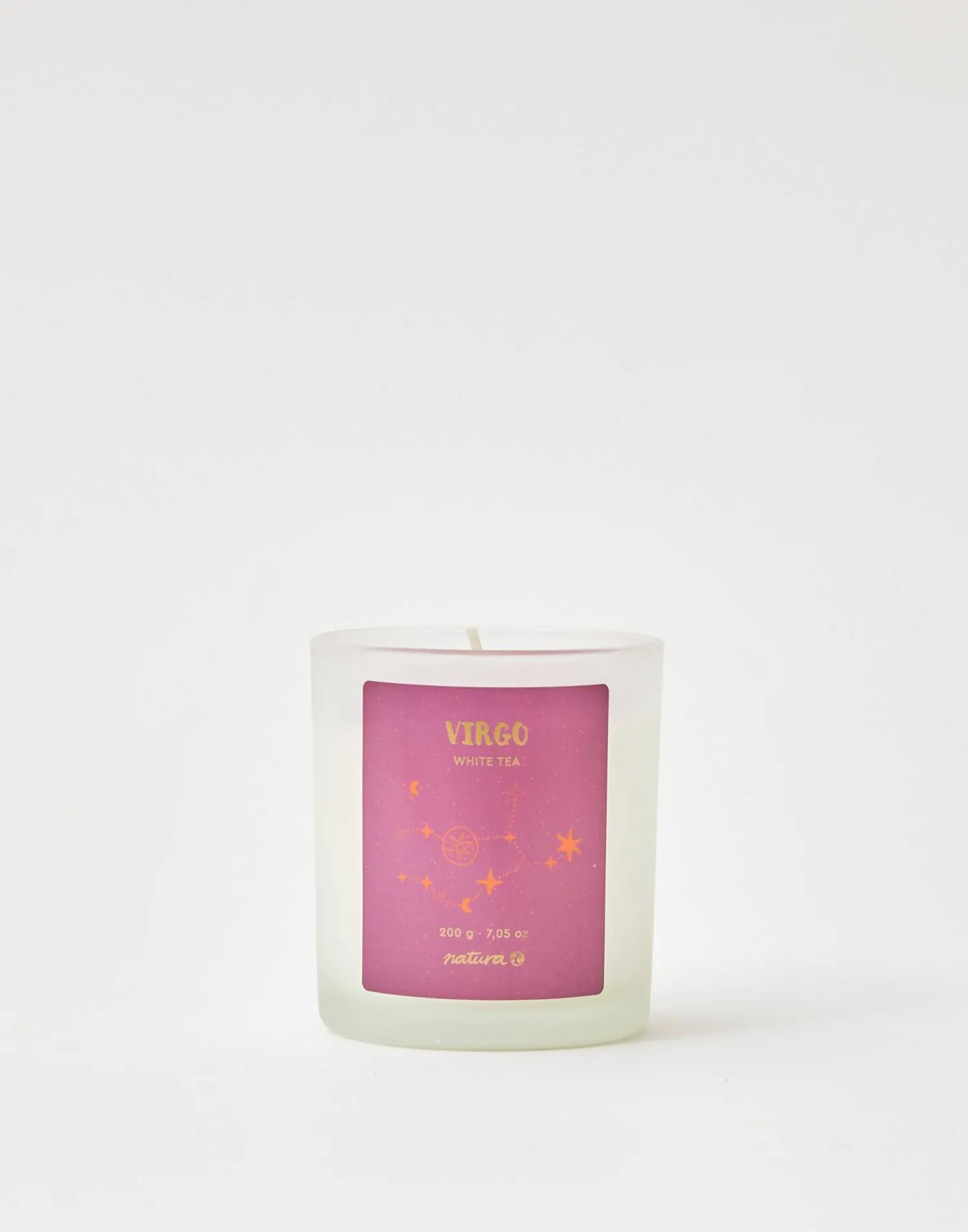 Velas hechas en España con cera vegetal de soja y con ilustración en la parte frontal representando cada signo del zodíaco.