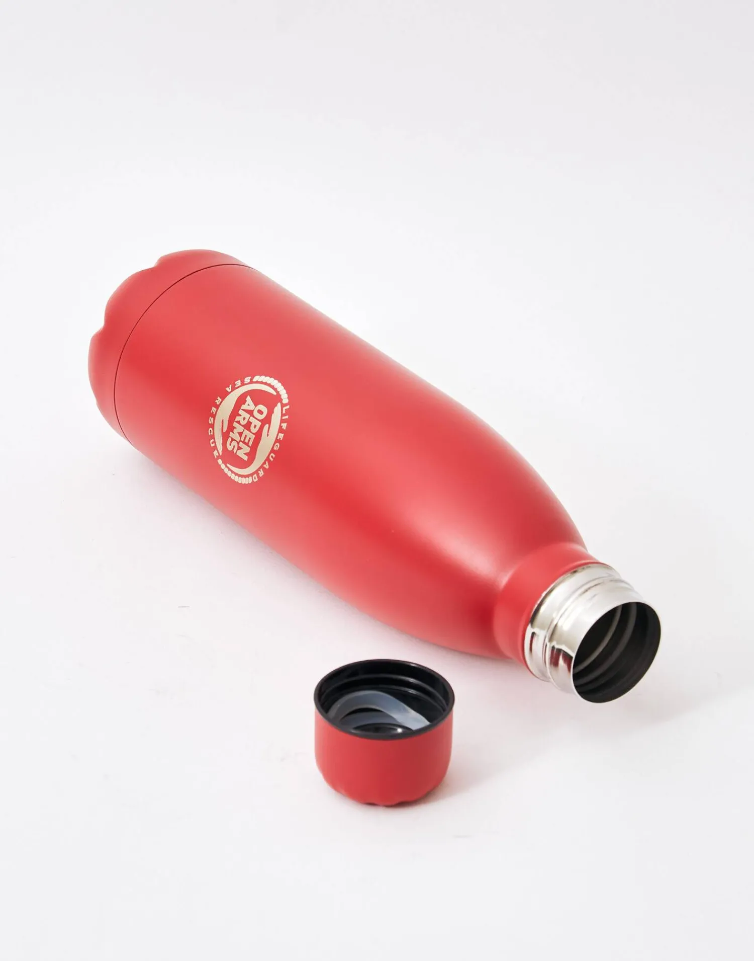 Botella reutilizable de acero inoxidable con tapón de seguridad con rosca. Lleva contigo el agua que necesitas, conservando su temperatura y declarando que eres cómplice de la causa de Open Arms. Tu contribución les ayuda a seguir salvando vidas.
