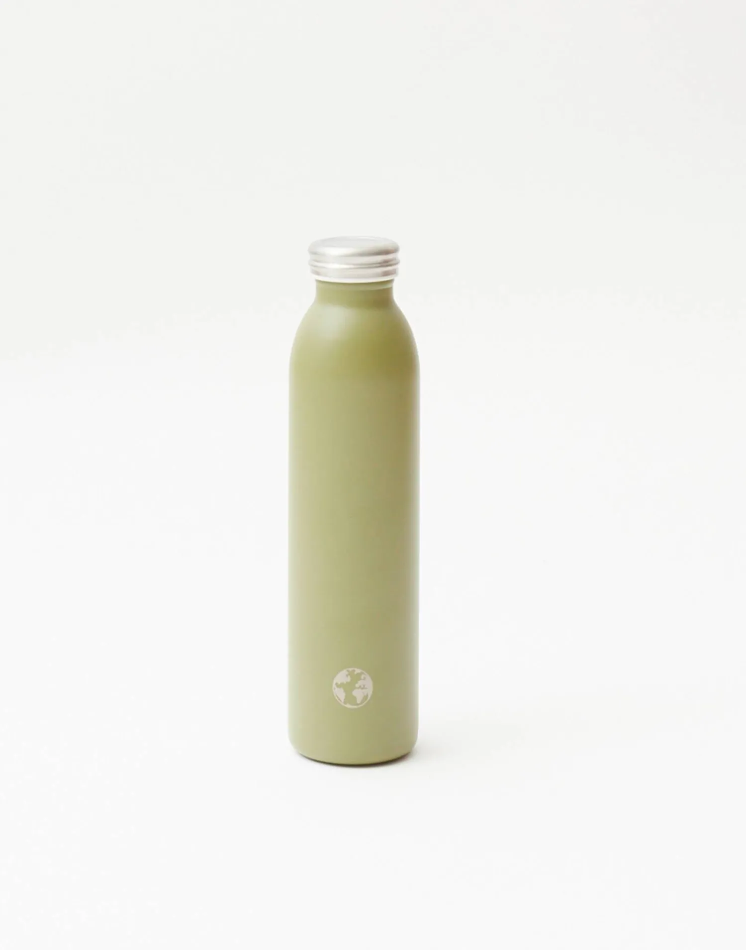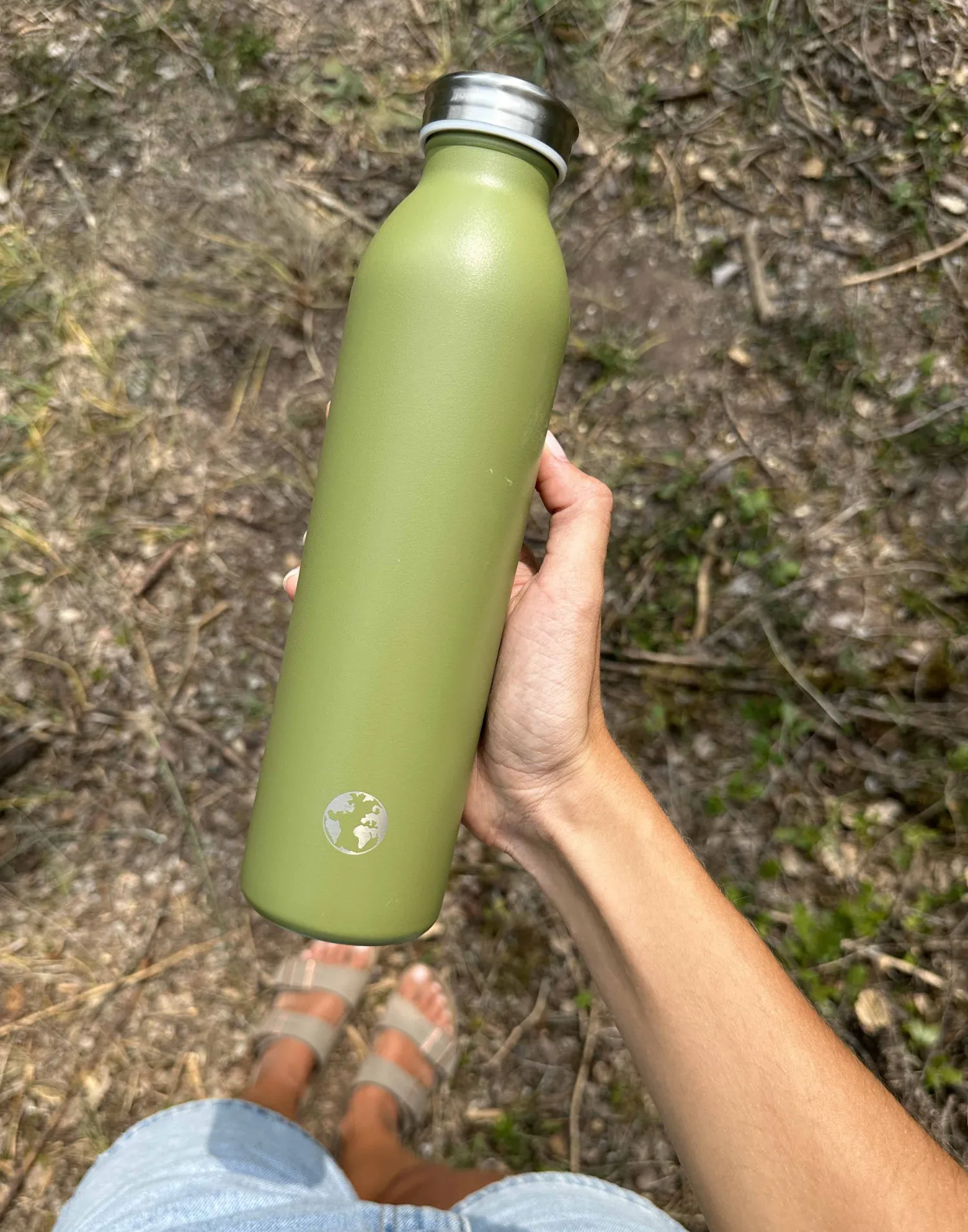 Botella metálica que puede utilizarse como termo. Base gomosa antideslizante para amortiguar golpes.