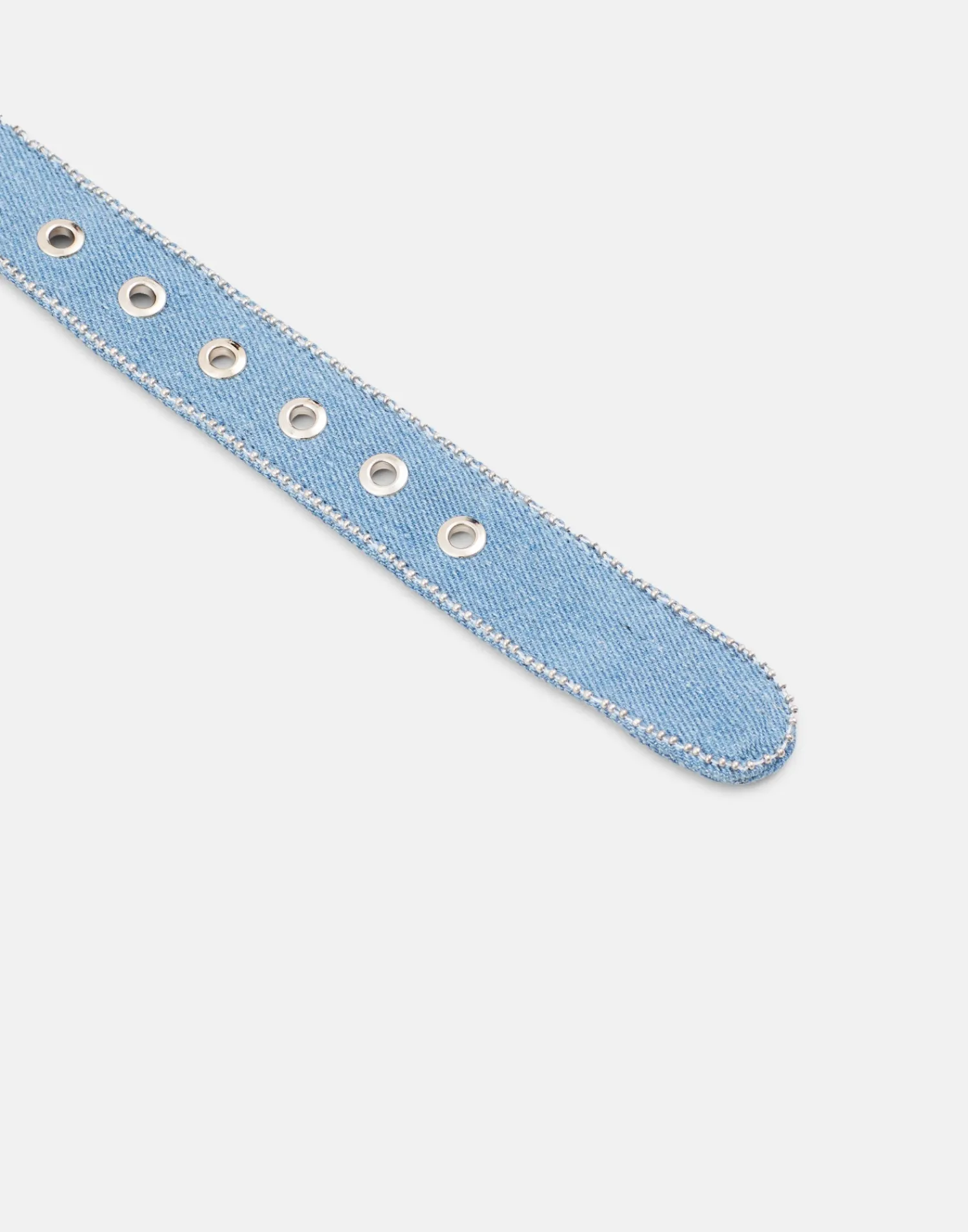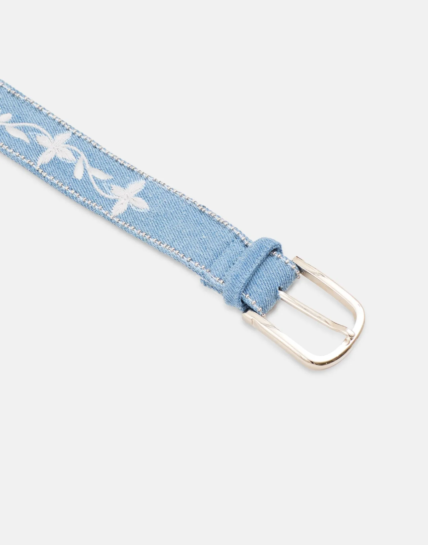 Cinturón acabado denim con detalles bordados y hebilla de metal.