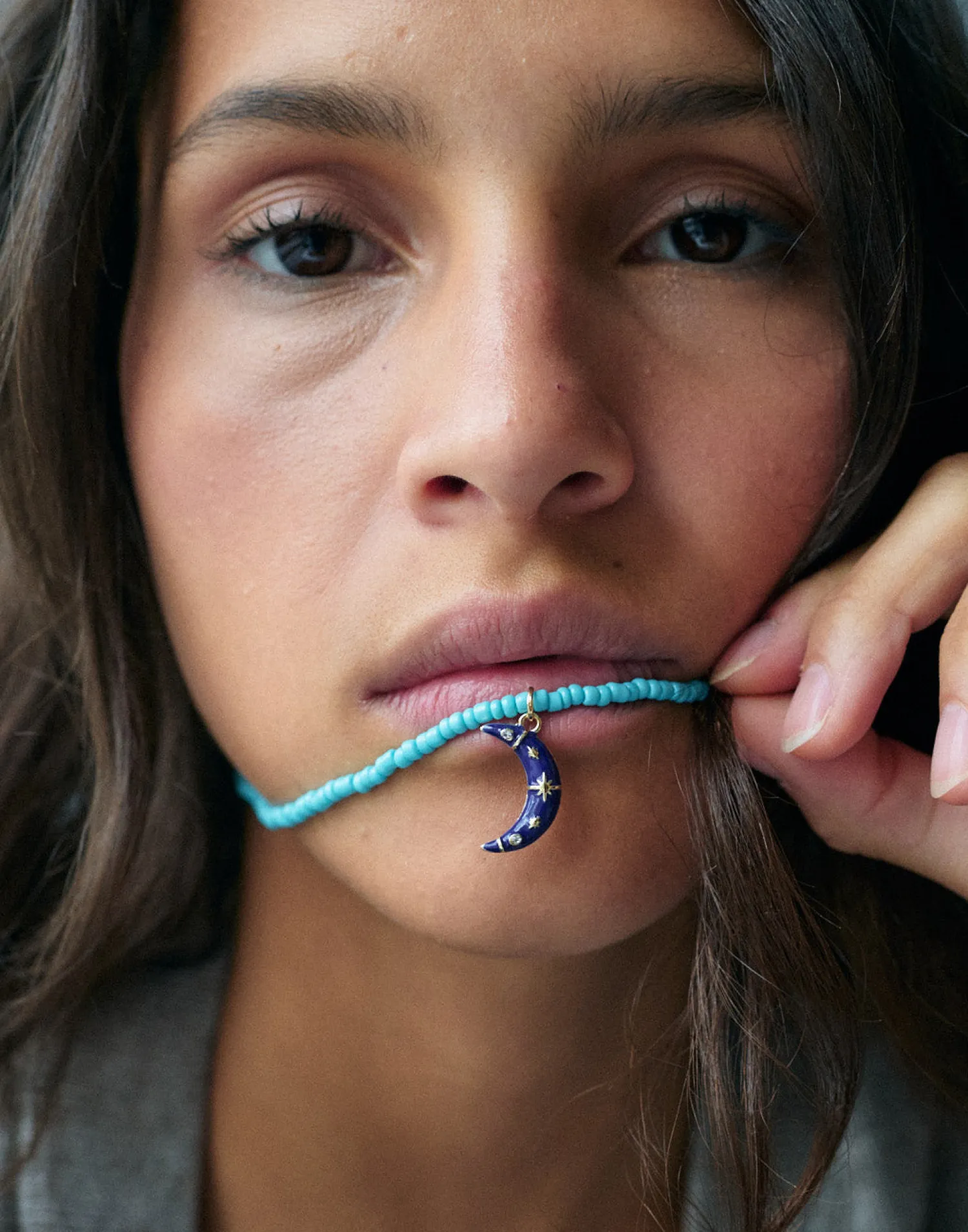 Collar de cuentas con abalorio en forma de luna. Cierre de cadena ajustable con mosquetón.
