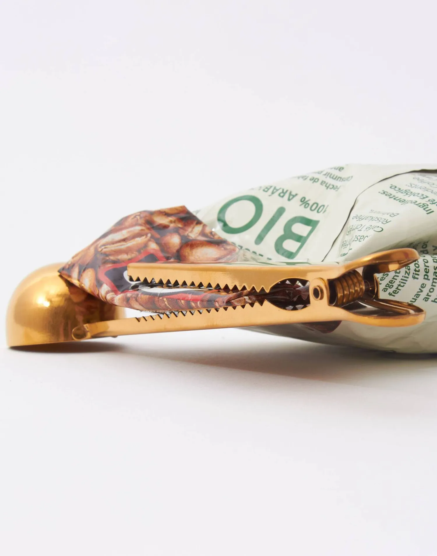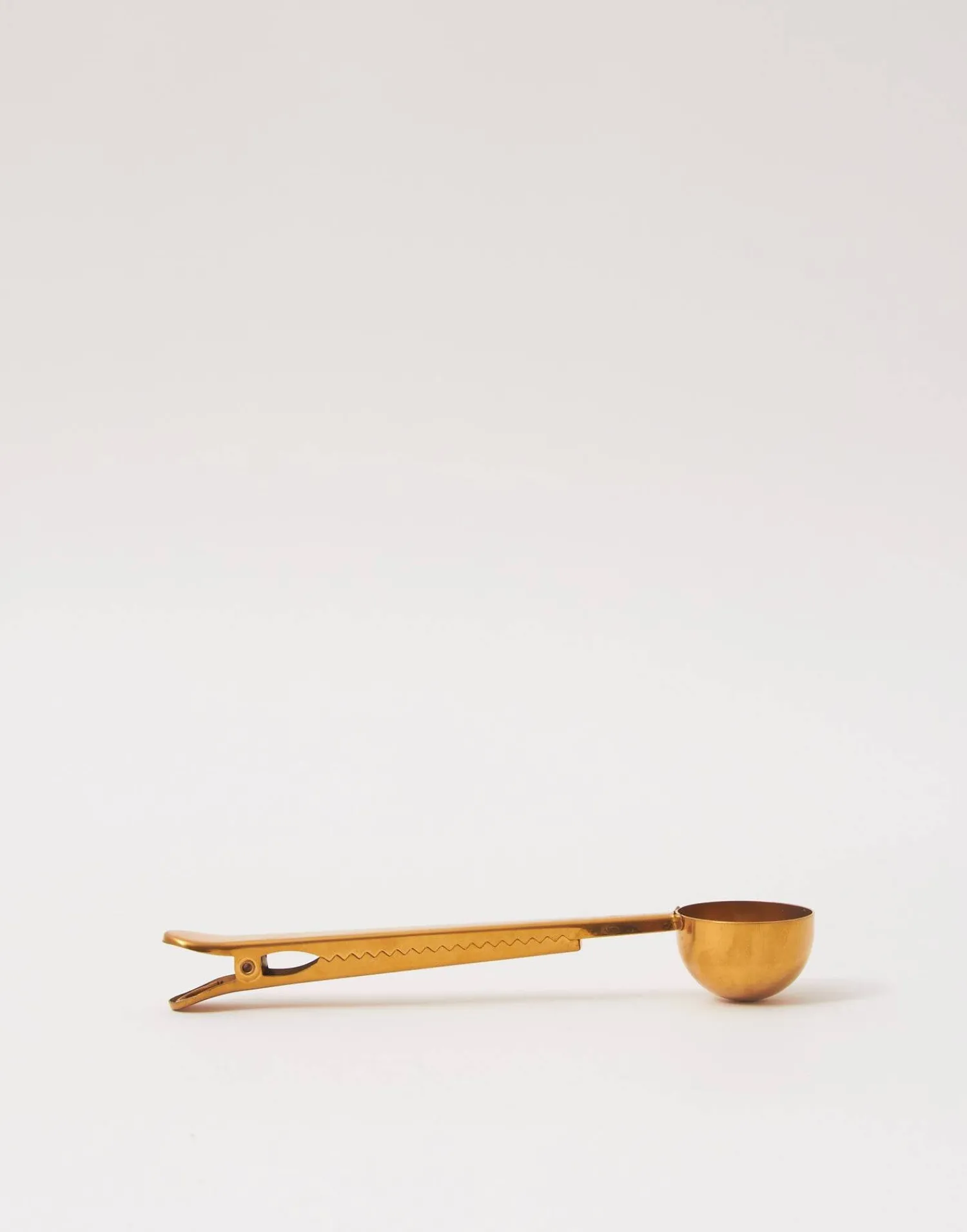 Cuchara para café o té en acero inoxidable, con diseño de pinza en el mango para cerrar el paquete de café.