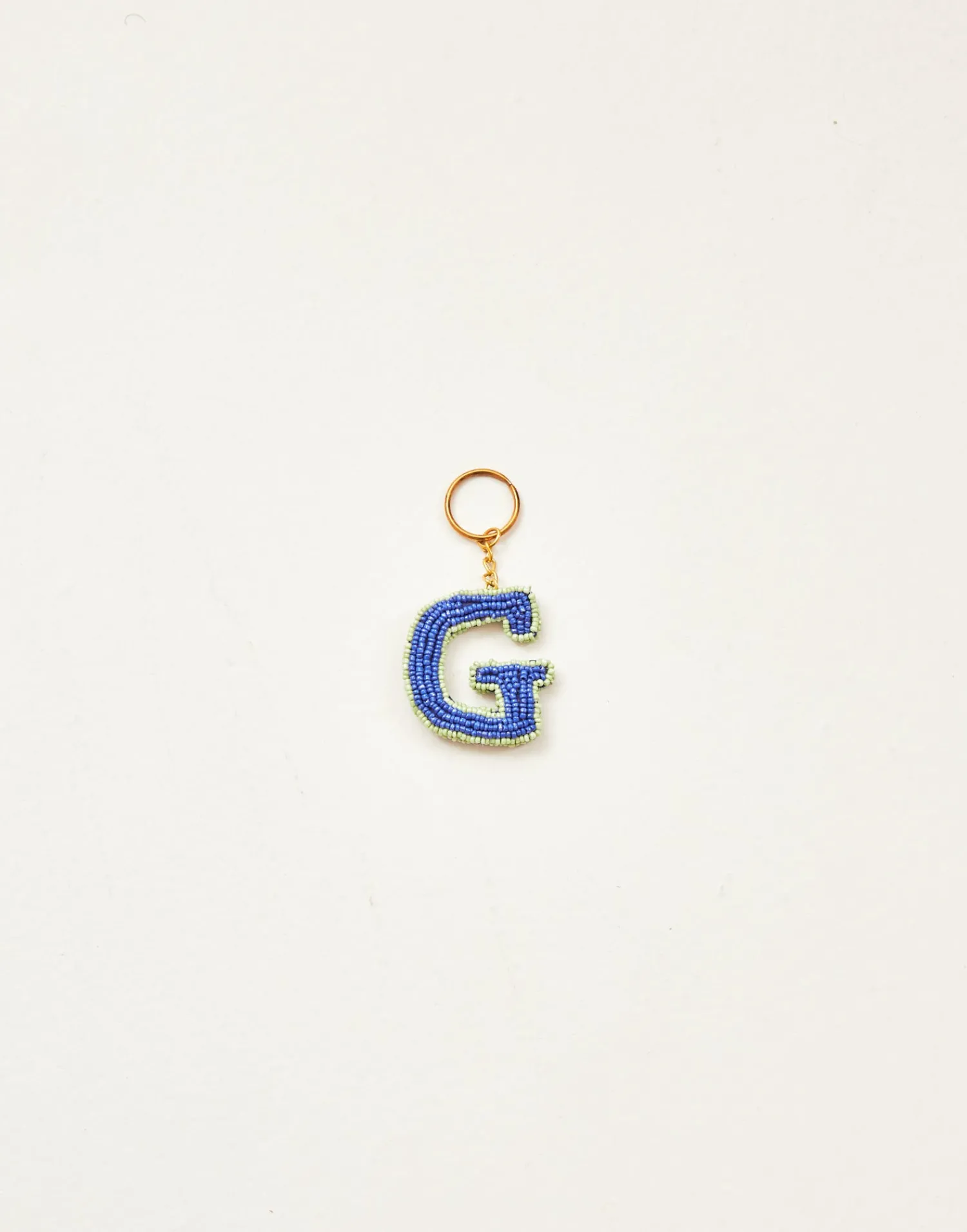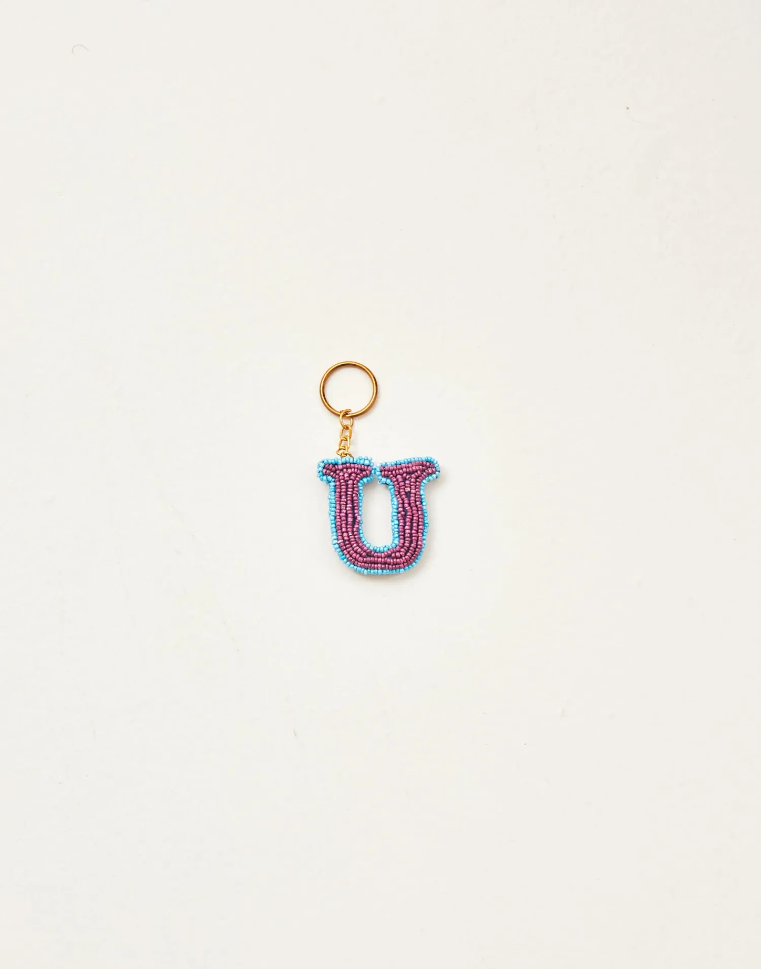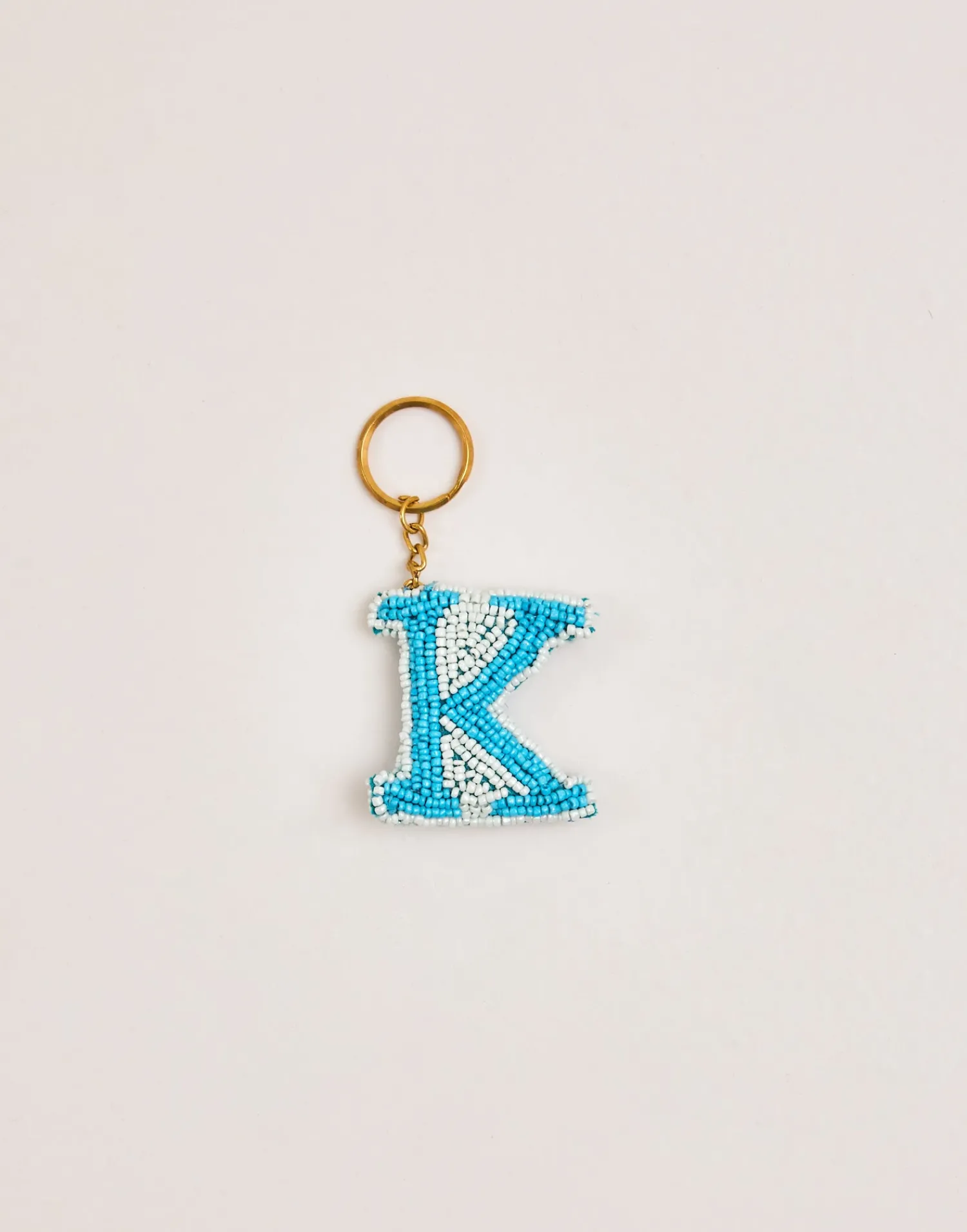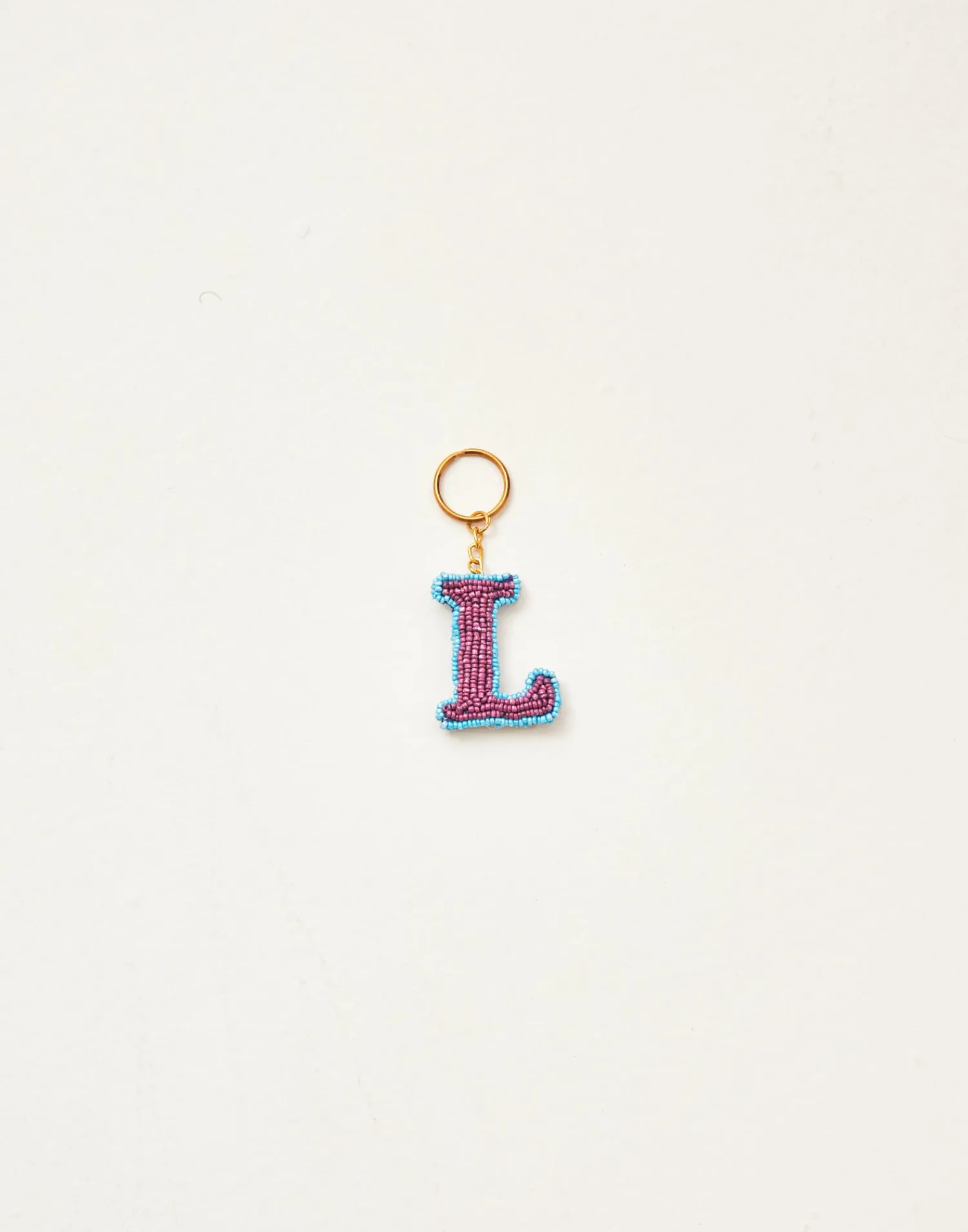 Llavero de letras hechas con cuentas de vidrio acabado con cadena y arandela.