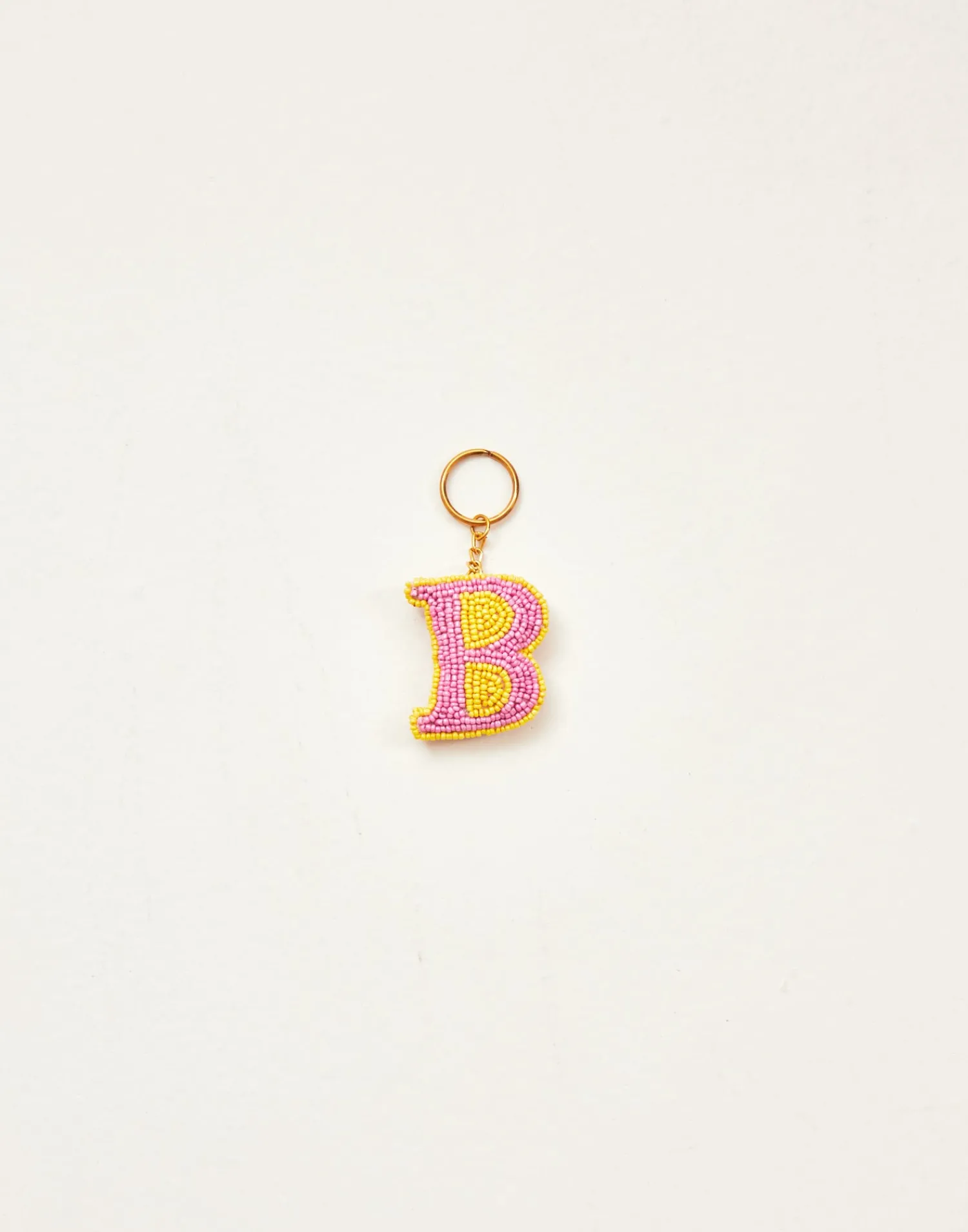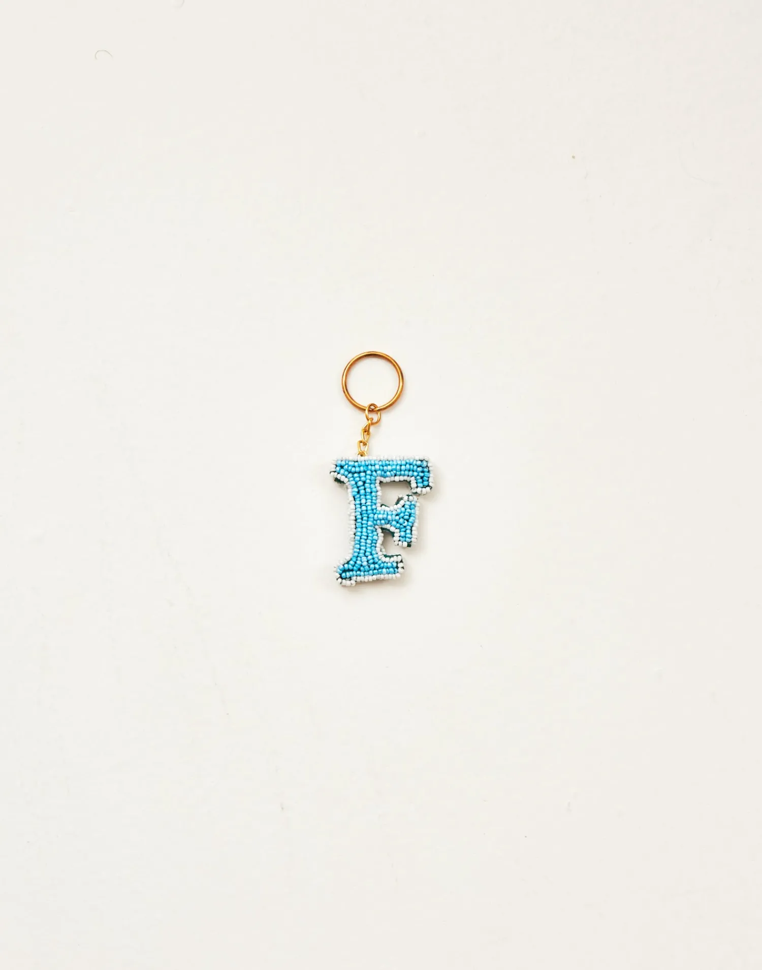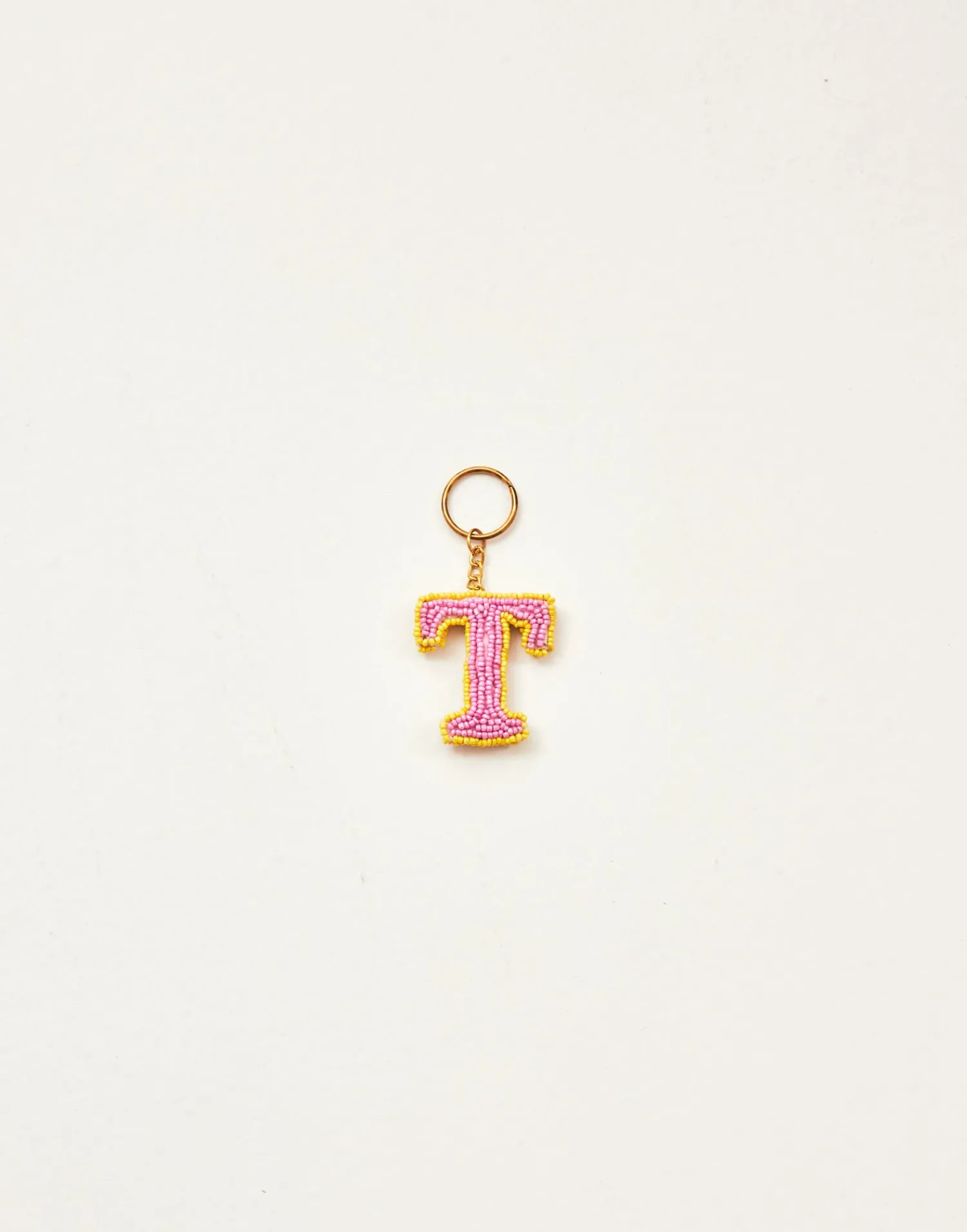 Llavero de letras hechas con cuentas de vidrio acabado con cadena y arandela.