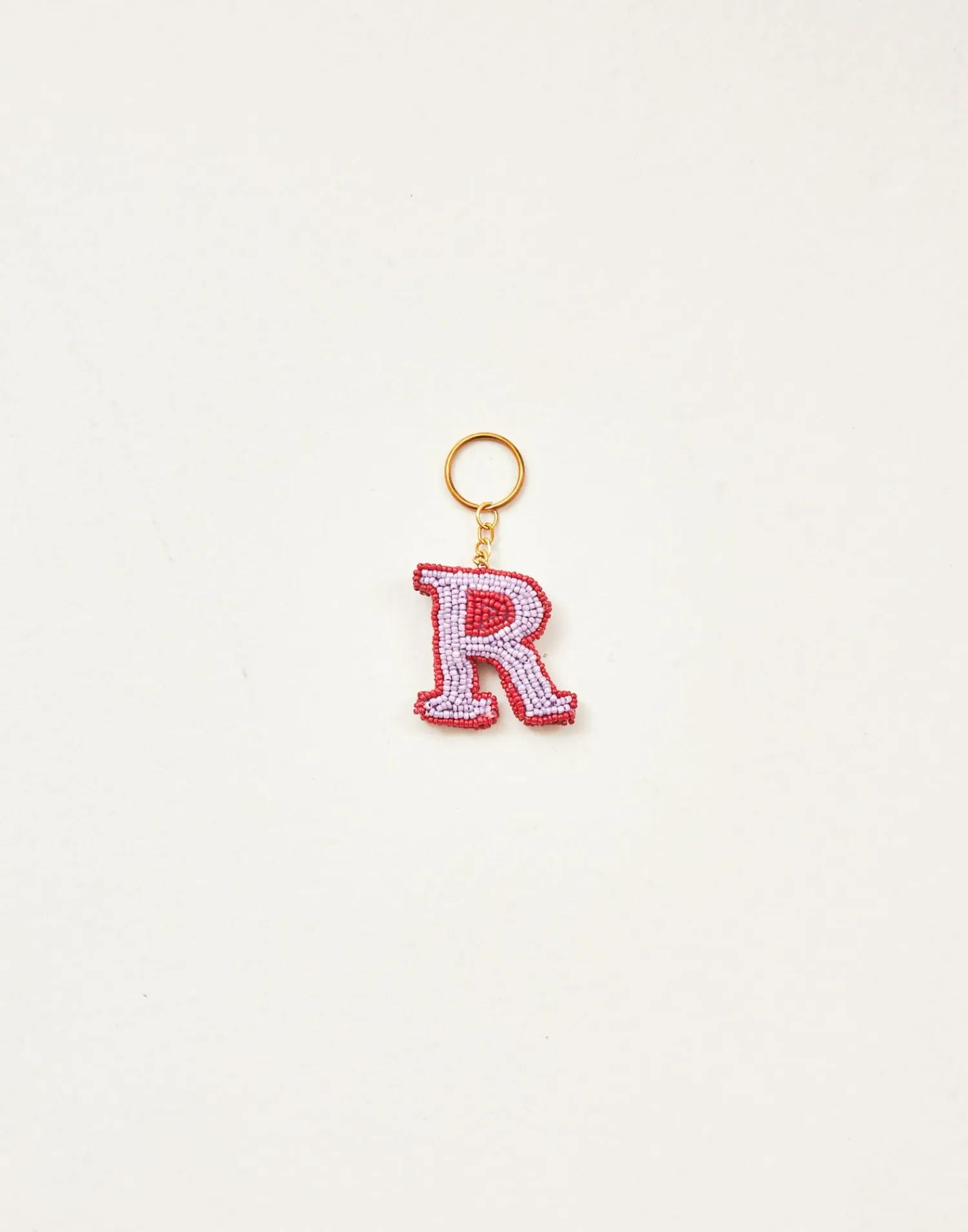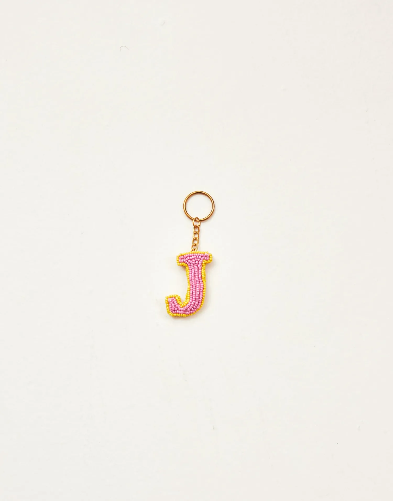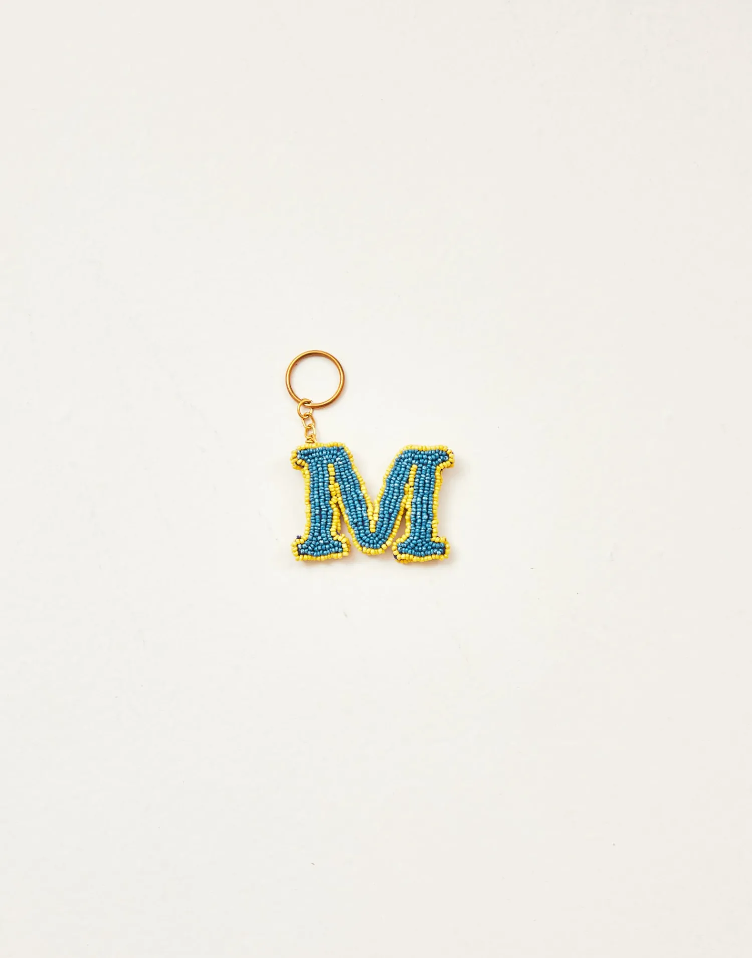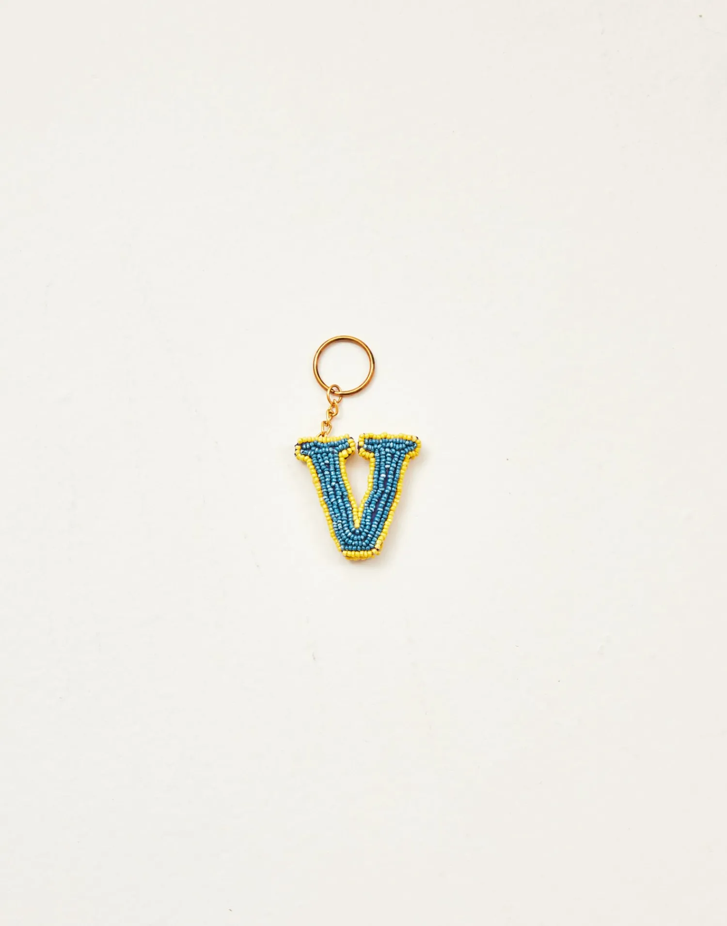 Llavero de letras hechas con cuentas de vidrio acabado con cadena y arandela.