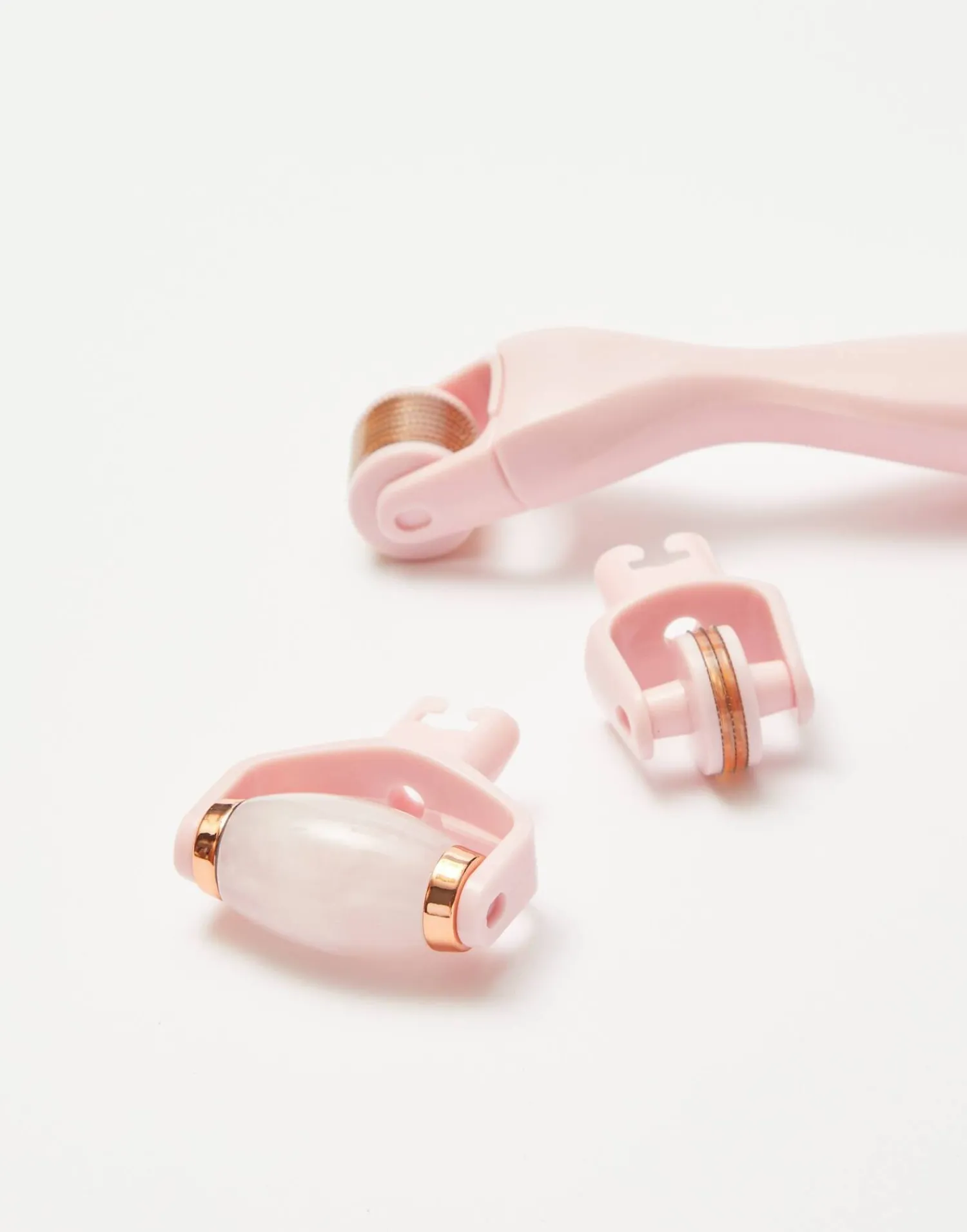 Incluye 3 cabezales: un cabezal de 600 micro agujas de 0,50mm, un cabezal de 180 micro agujas de 0,50mm para el rostro y zonas pequeñas y un rodillo de cuarzo rosa.