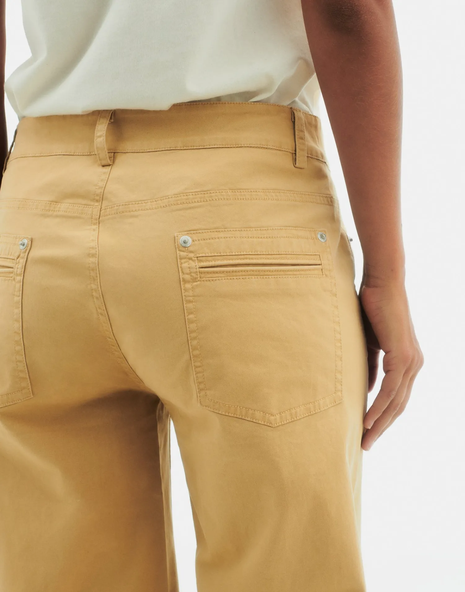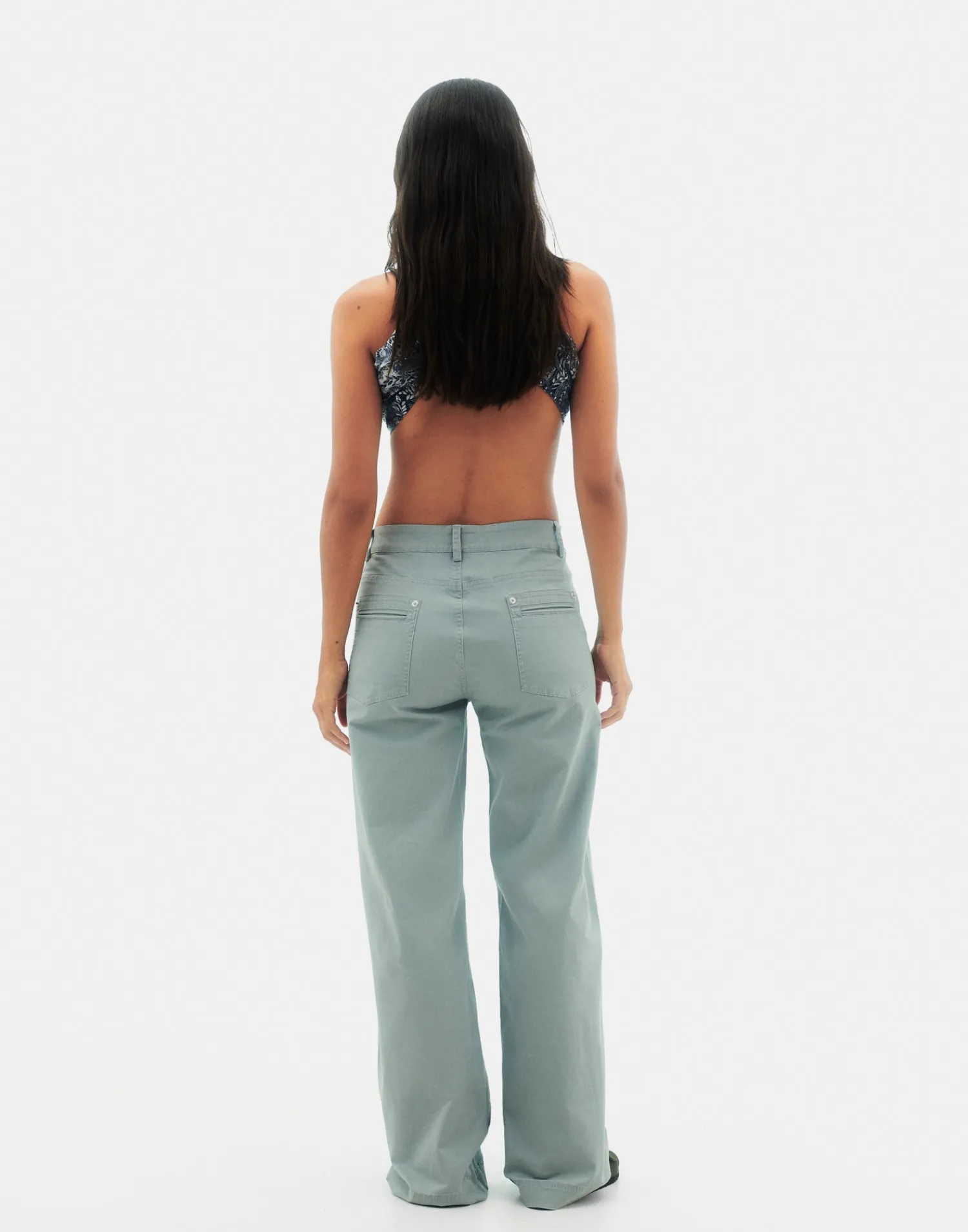 Pantalón recto, con cinco bolsillos y cintura con trabillas. Cierre frontal con cremallera y botón.