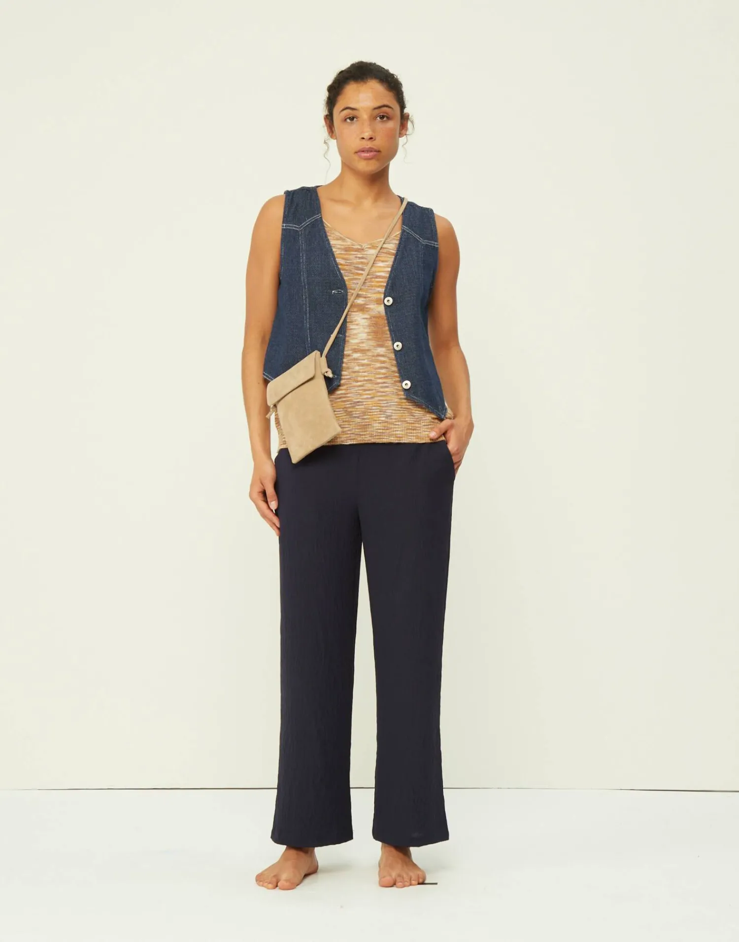 Pantalón recto con cintura elástica y bolsillos laterales.