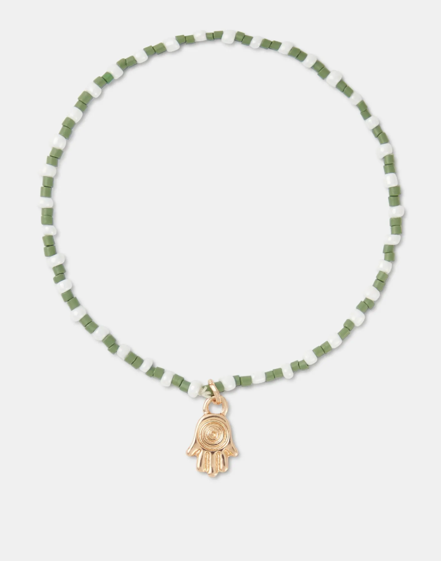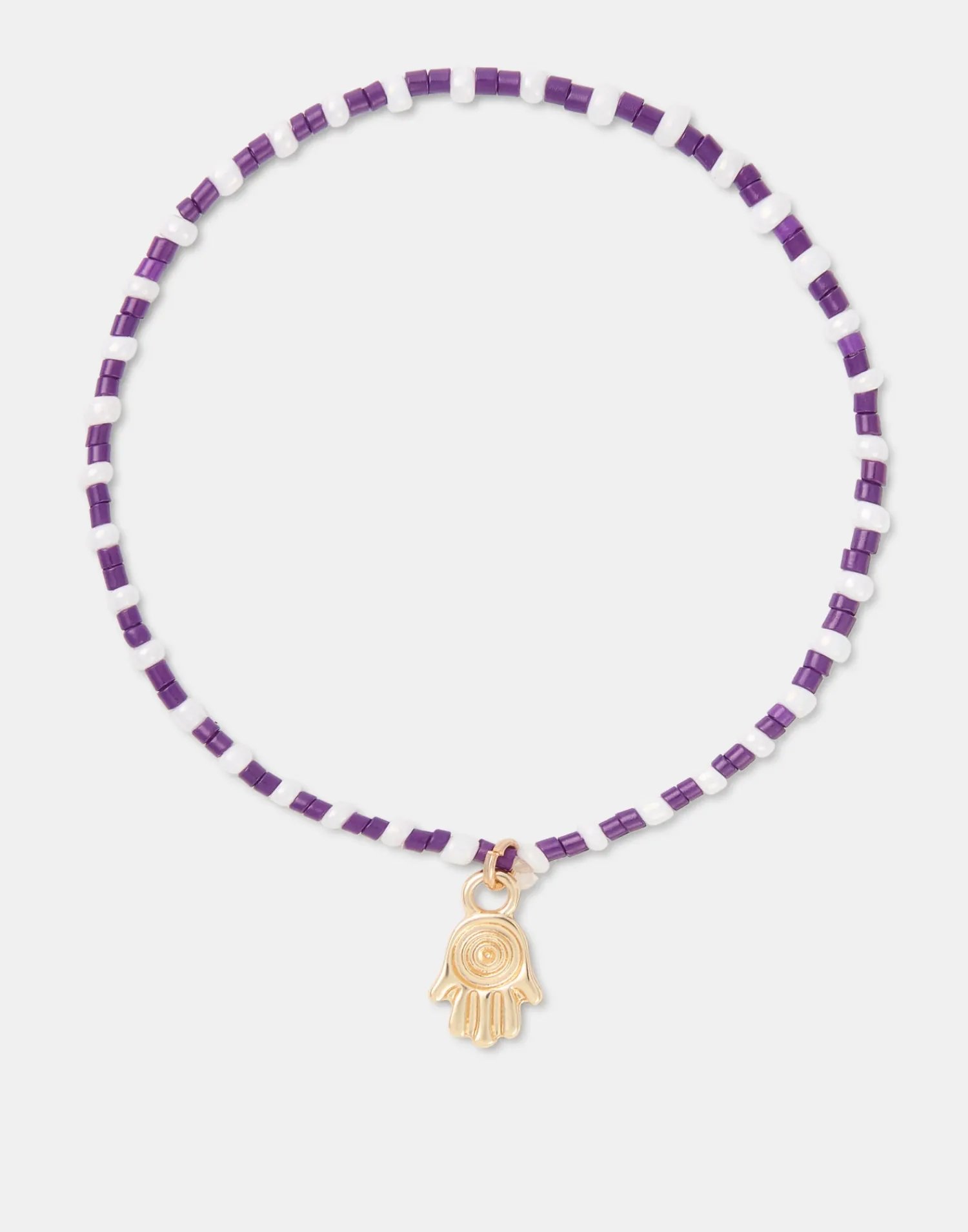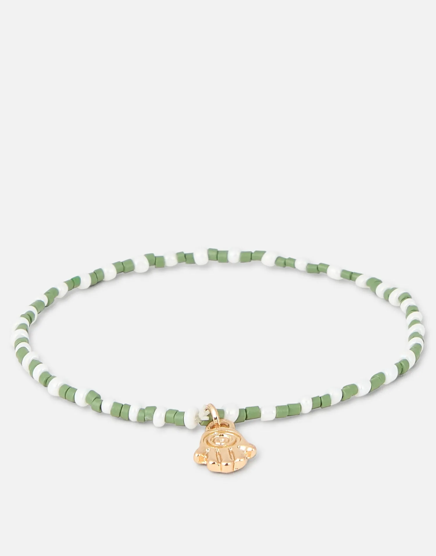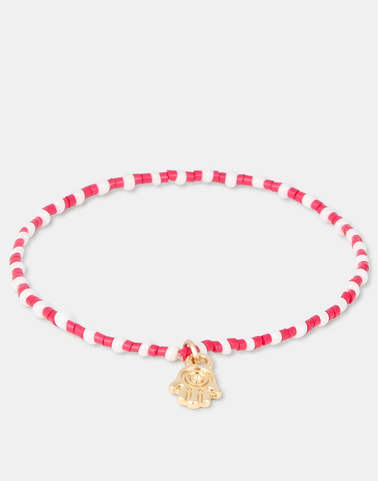 Pulsera elástica con cuentas de colores y abalorio dorado.
