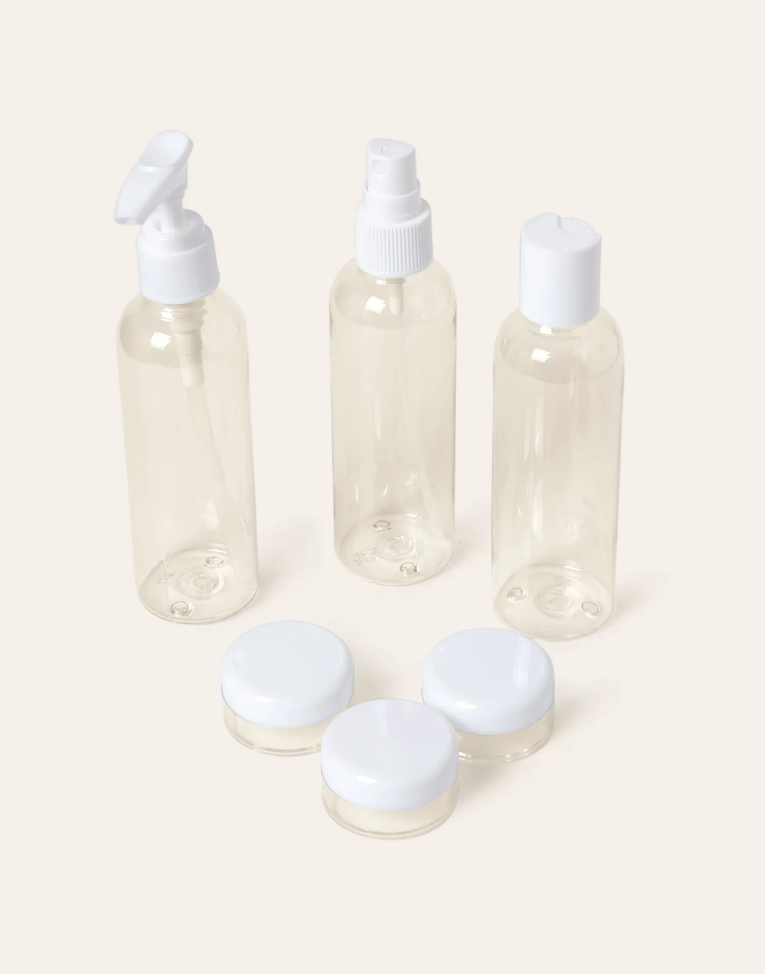 Neceser de viaje con 3 botellitas y 3 botecitos, el kit indispensable en cualquier maleta. Son rellenables, y en ellas podemos transportar muy cómodamente productos de baño, higiene o cosmética. Su tamaño está especialmente pensado para que puedas llevar este accesorio de viaje como equipaje de cabina sin ningún problema.