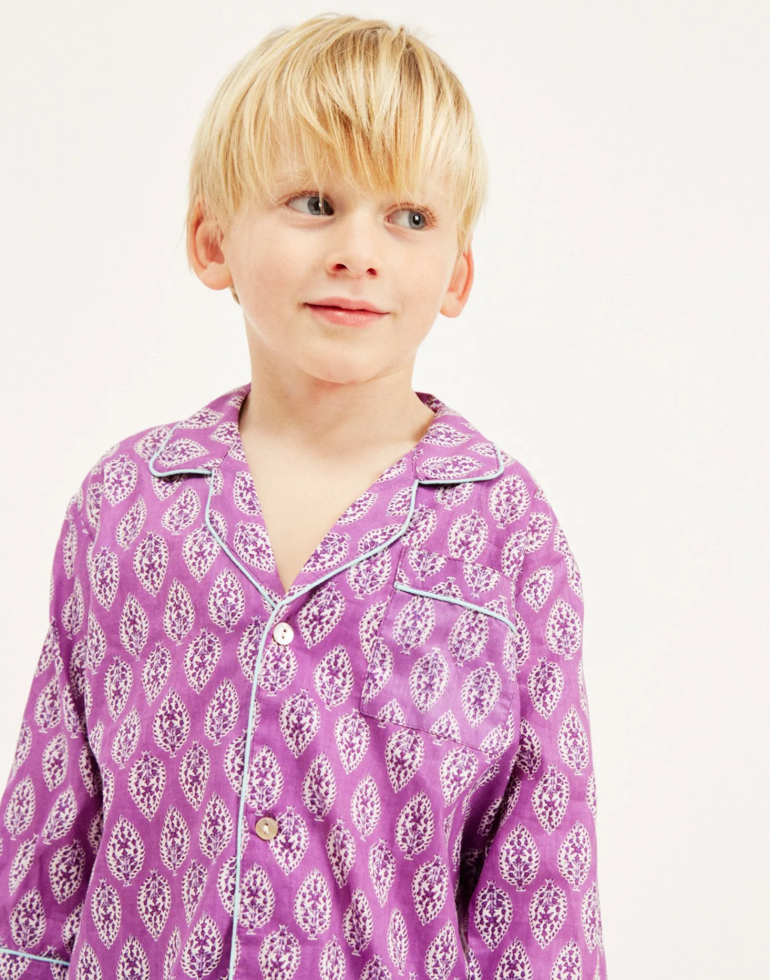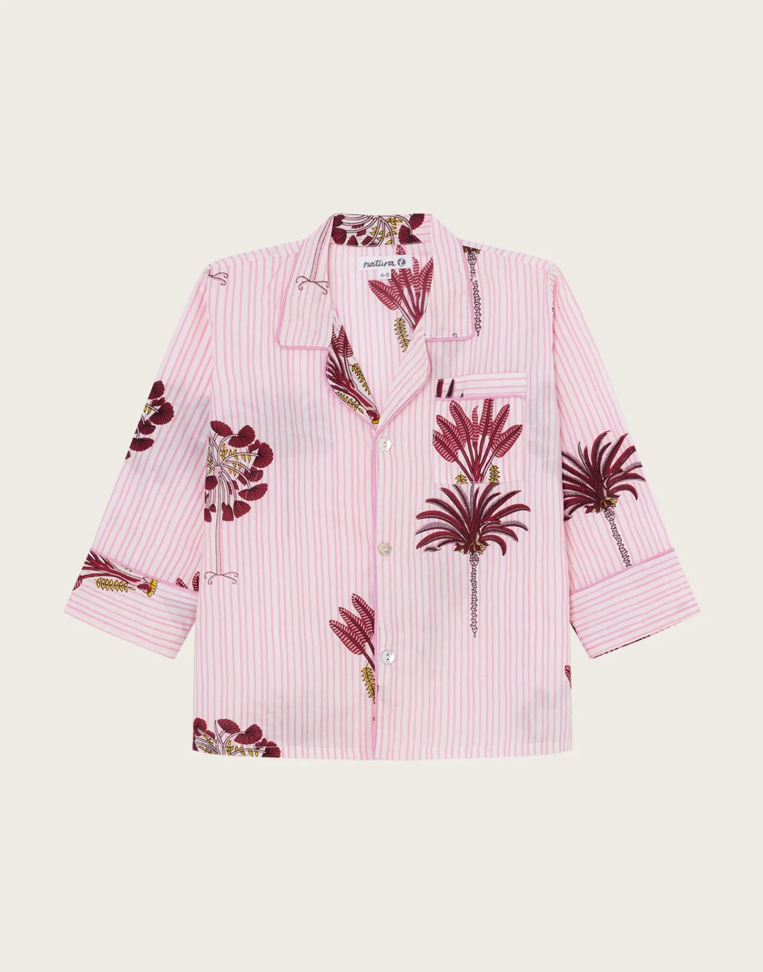 La camisa tiene cuello solapa, bolsillo de plastrón y cierre frontal de botones. El pantalón tiene cintura elástica ajustable mediante lazo y bolsillos laterales.