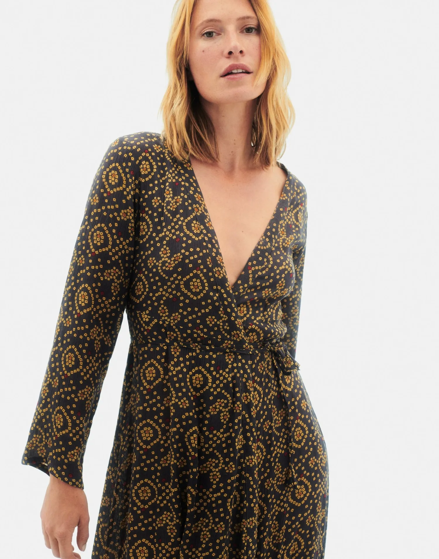 Vestido con estampado estilo bandani. De manga larga, escote de pico y cierre de cinturón a tono.
