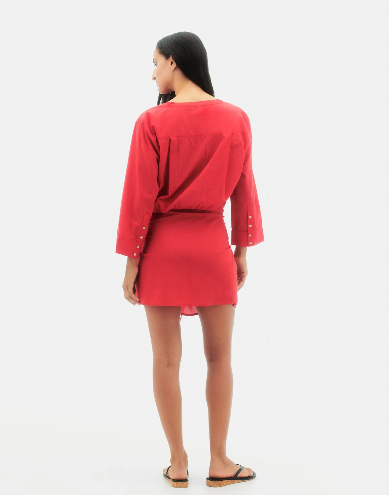 Vestido corto tipo kurta con detalles bordados, manga larga con puño abotonado y cuello redondo. Acabado con cierre de lazo en la parte frontal.
