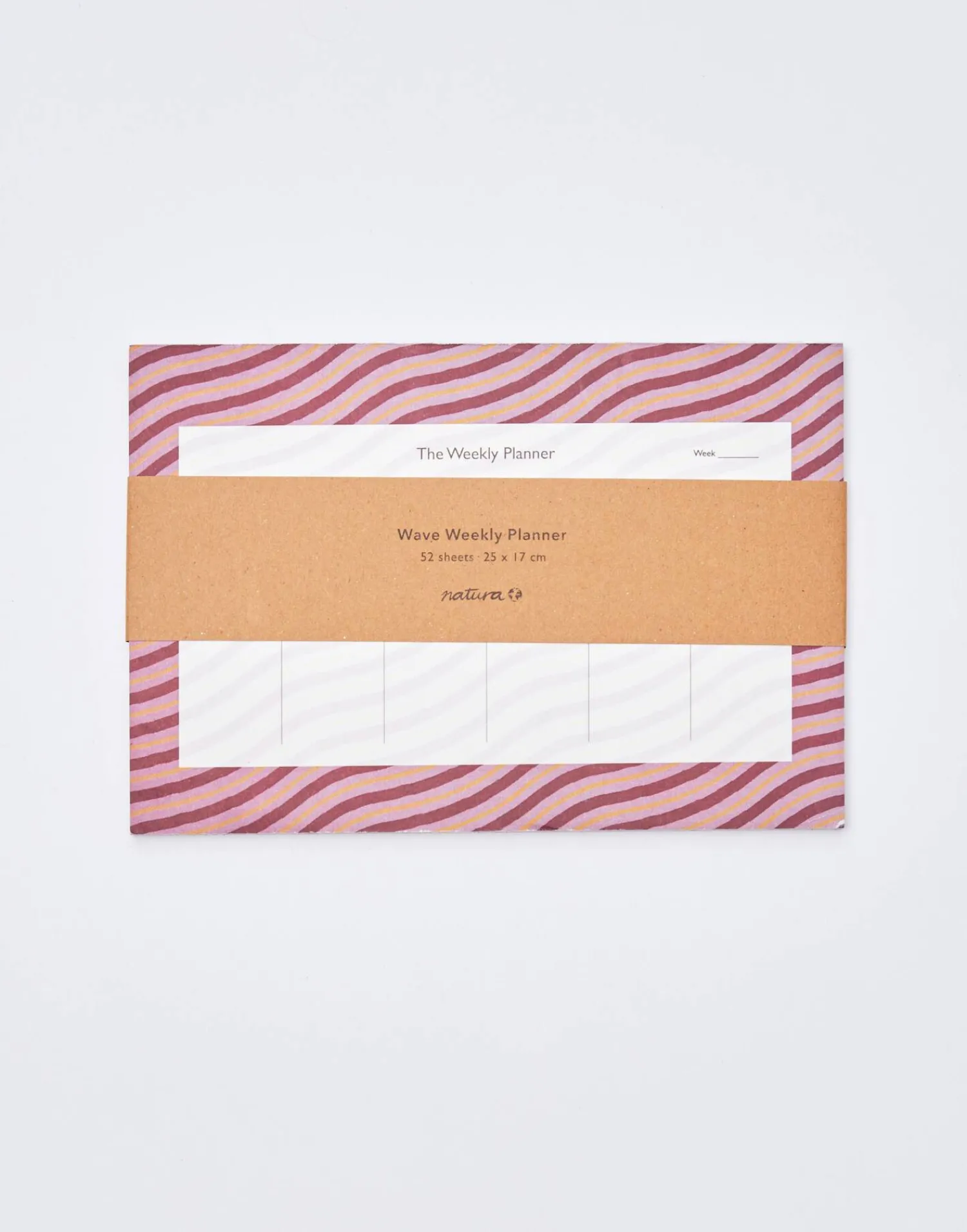 Organizador semanal en formato de bloc de hojas. Compuesto por 52 páginas con detalles en los bordes.