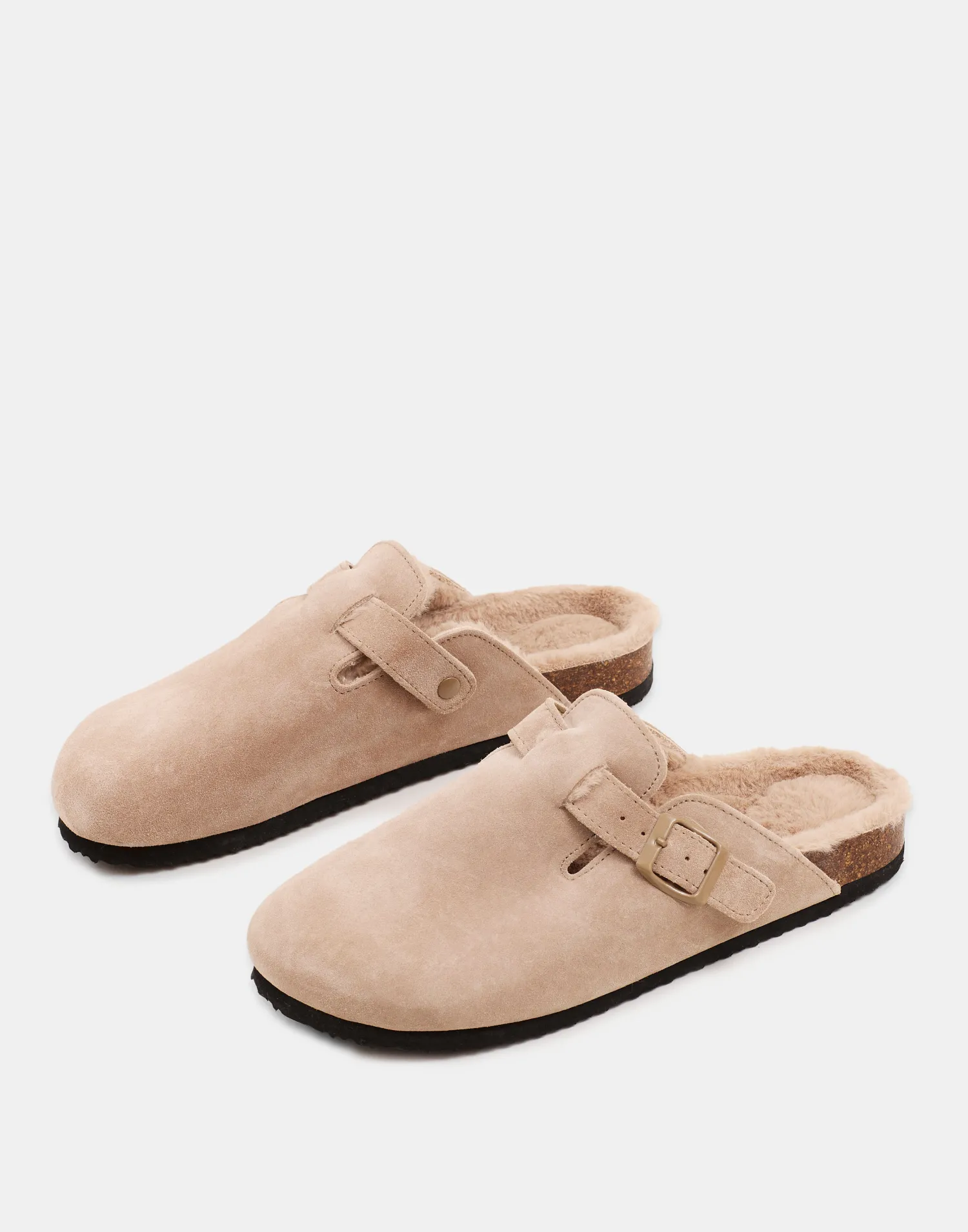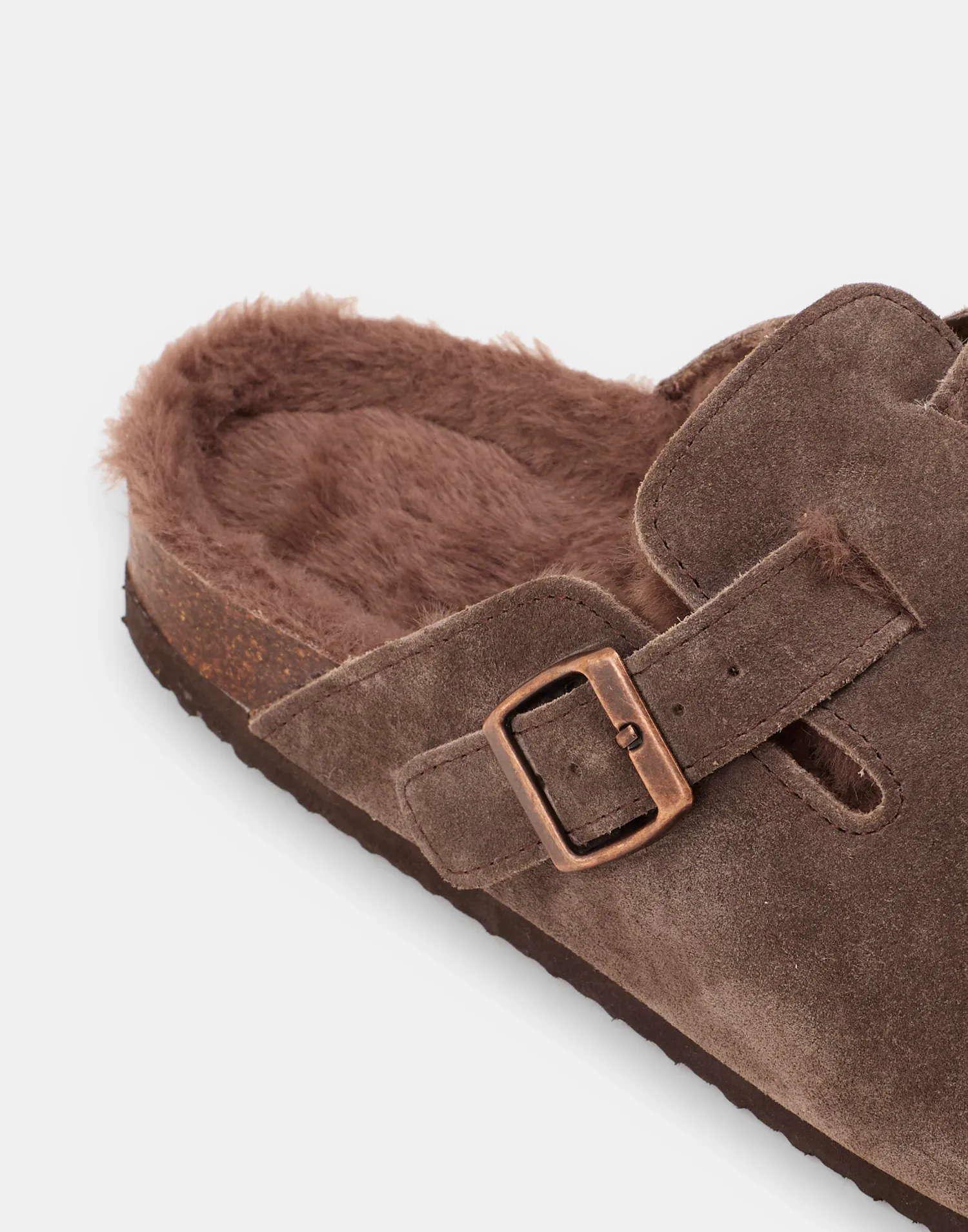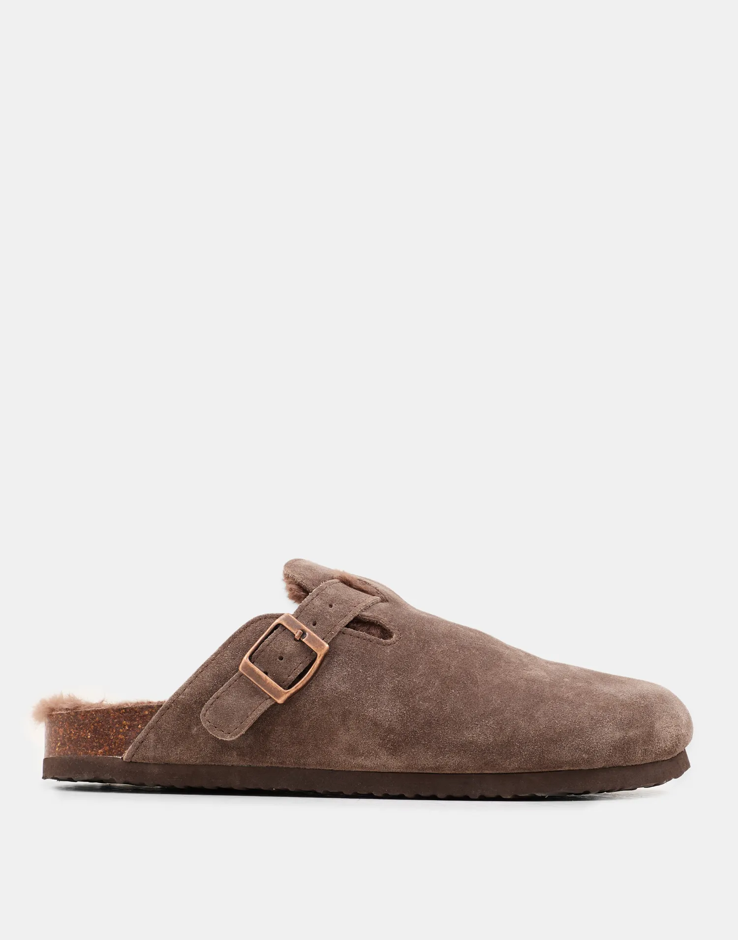 Zueco en piel y forro interior calentito. Con detalle de hebilla y suela de corcho.