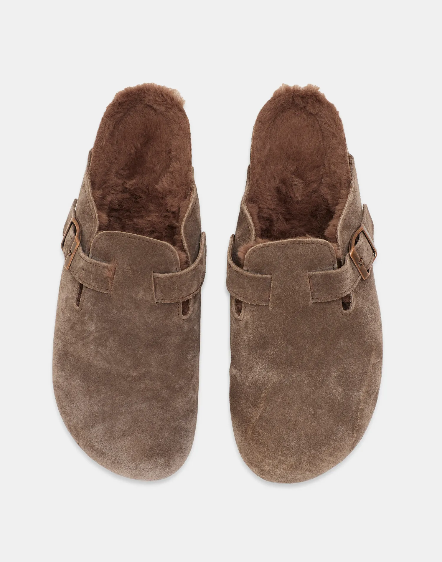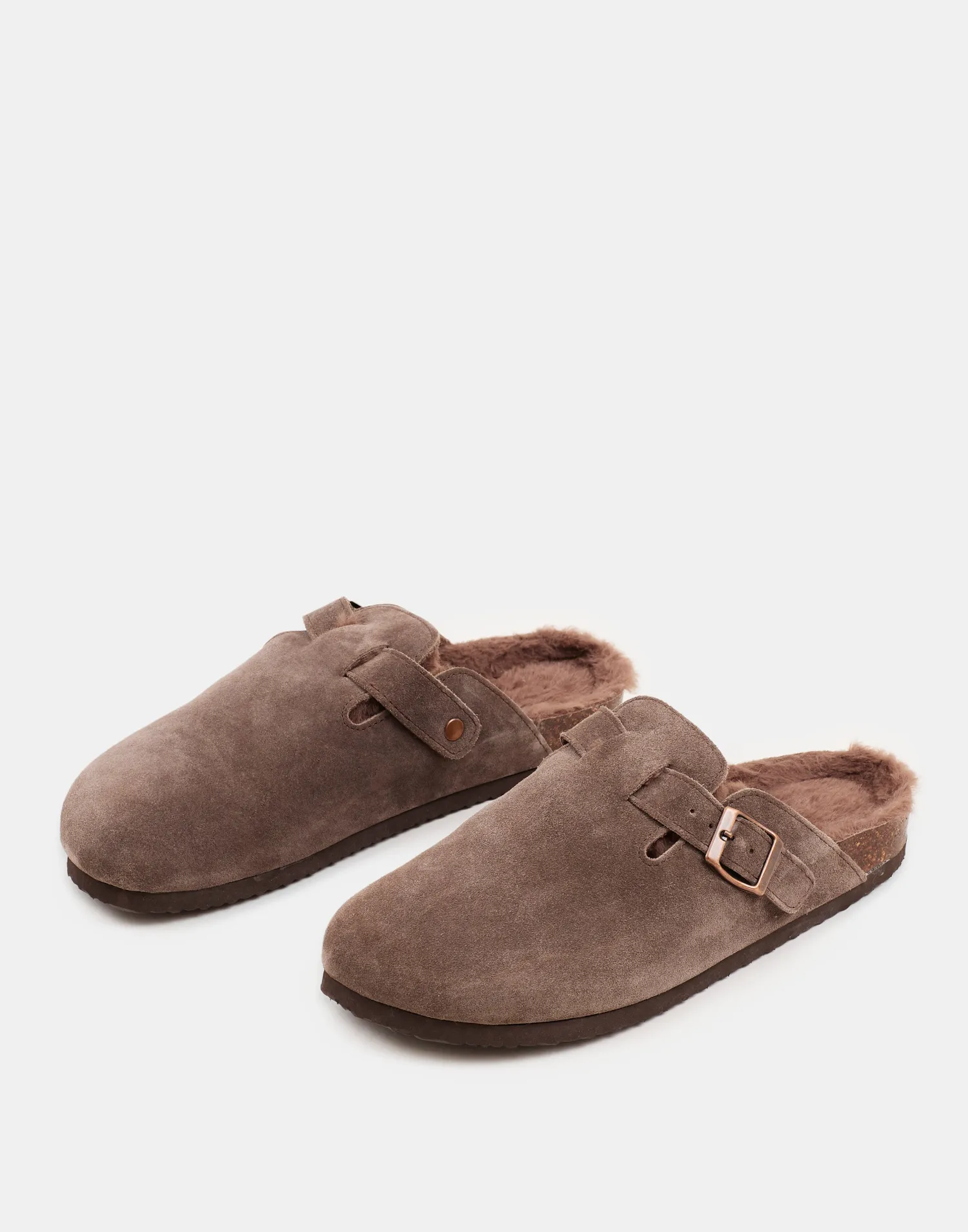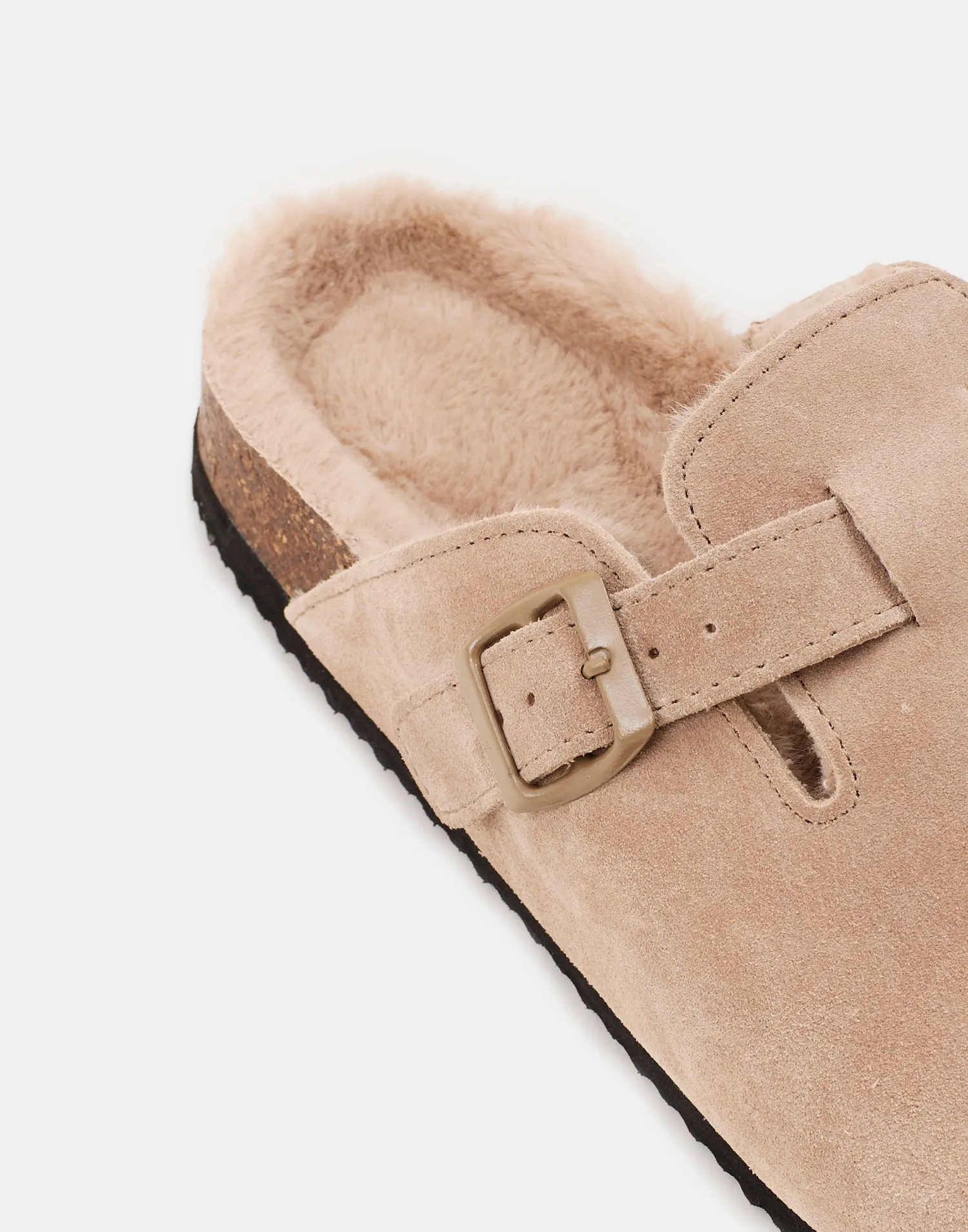 Zueco en piel y forro interior calentito. Con detalle de hebilla y suela de corcho.